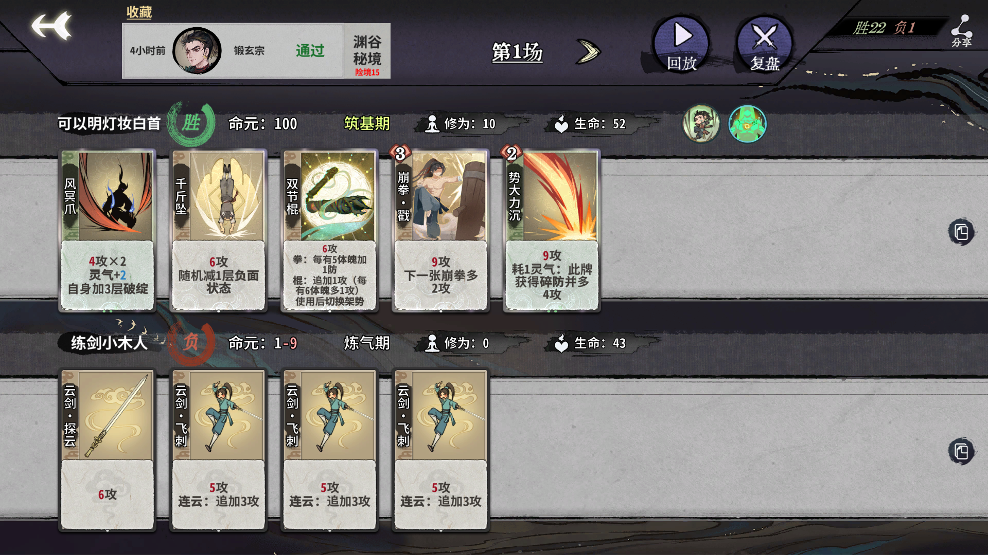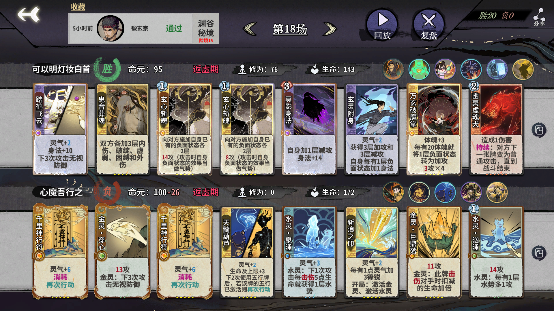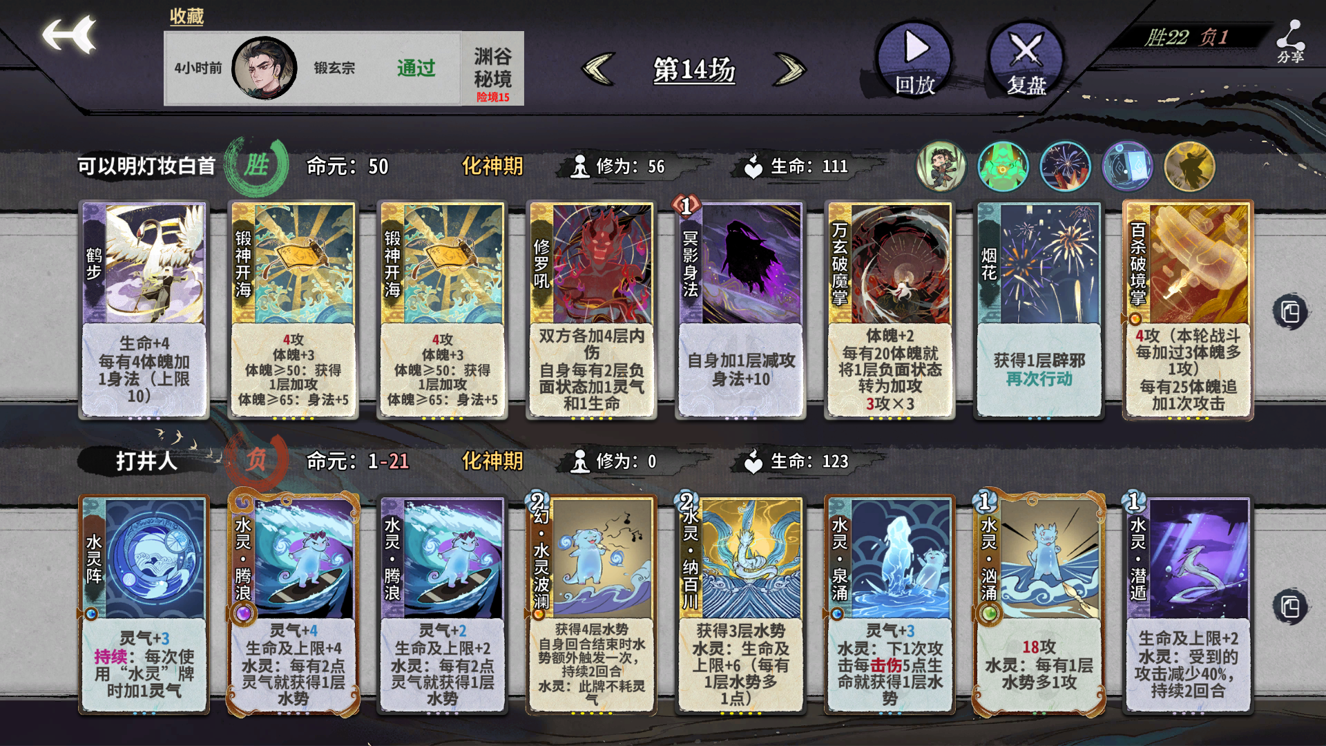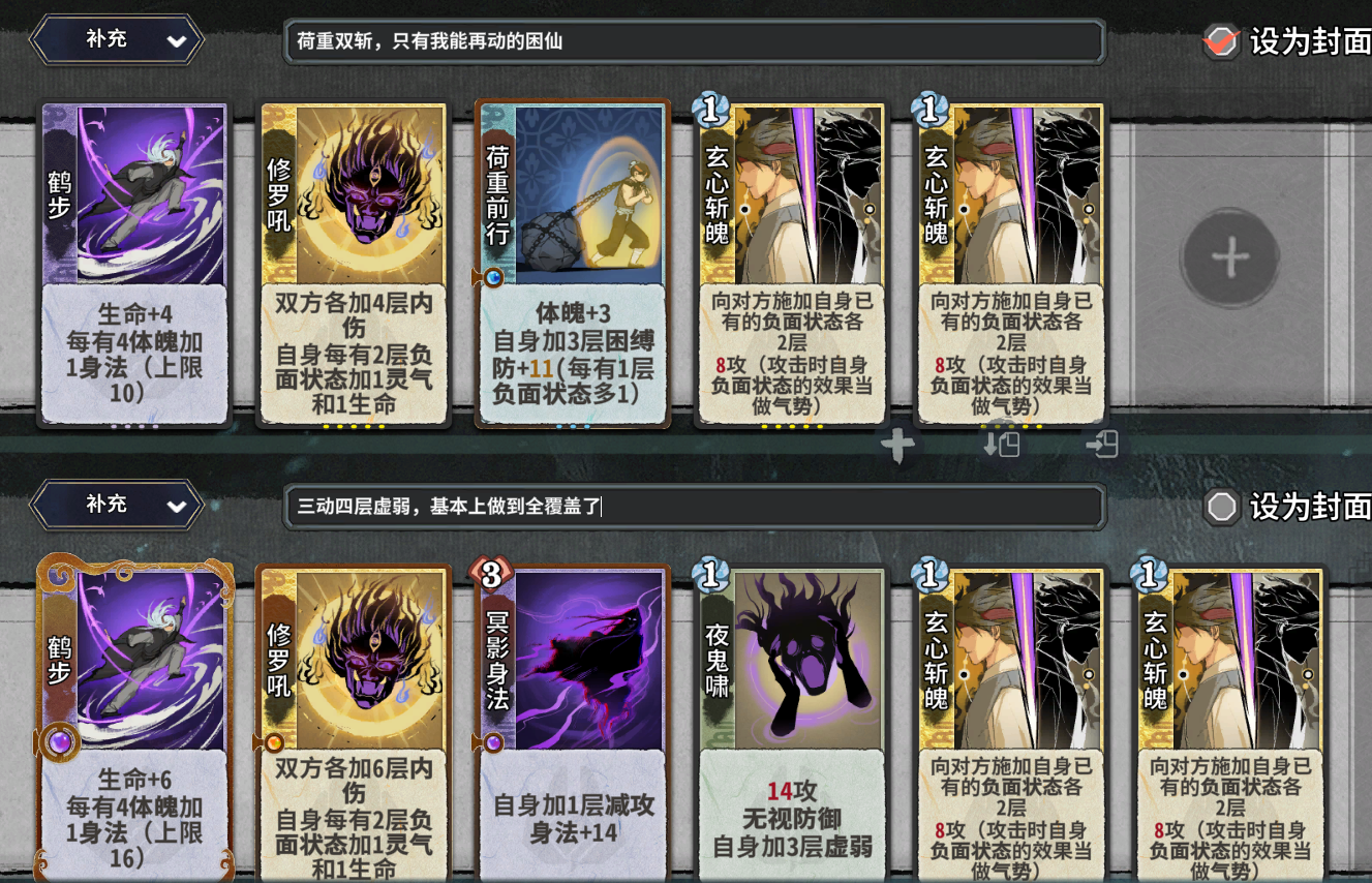 李㵘的先天仙命使得我们能够快速补体魄,故同样在前期不着急锻体,以赢为主,能赢再锻。但是不点化神仙命灵气会自动转为体魄,在金丹元婴期我们可以选择的卡组反而较少,只能尽量以崩拳、迎风等卡组进行过渡了。