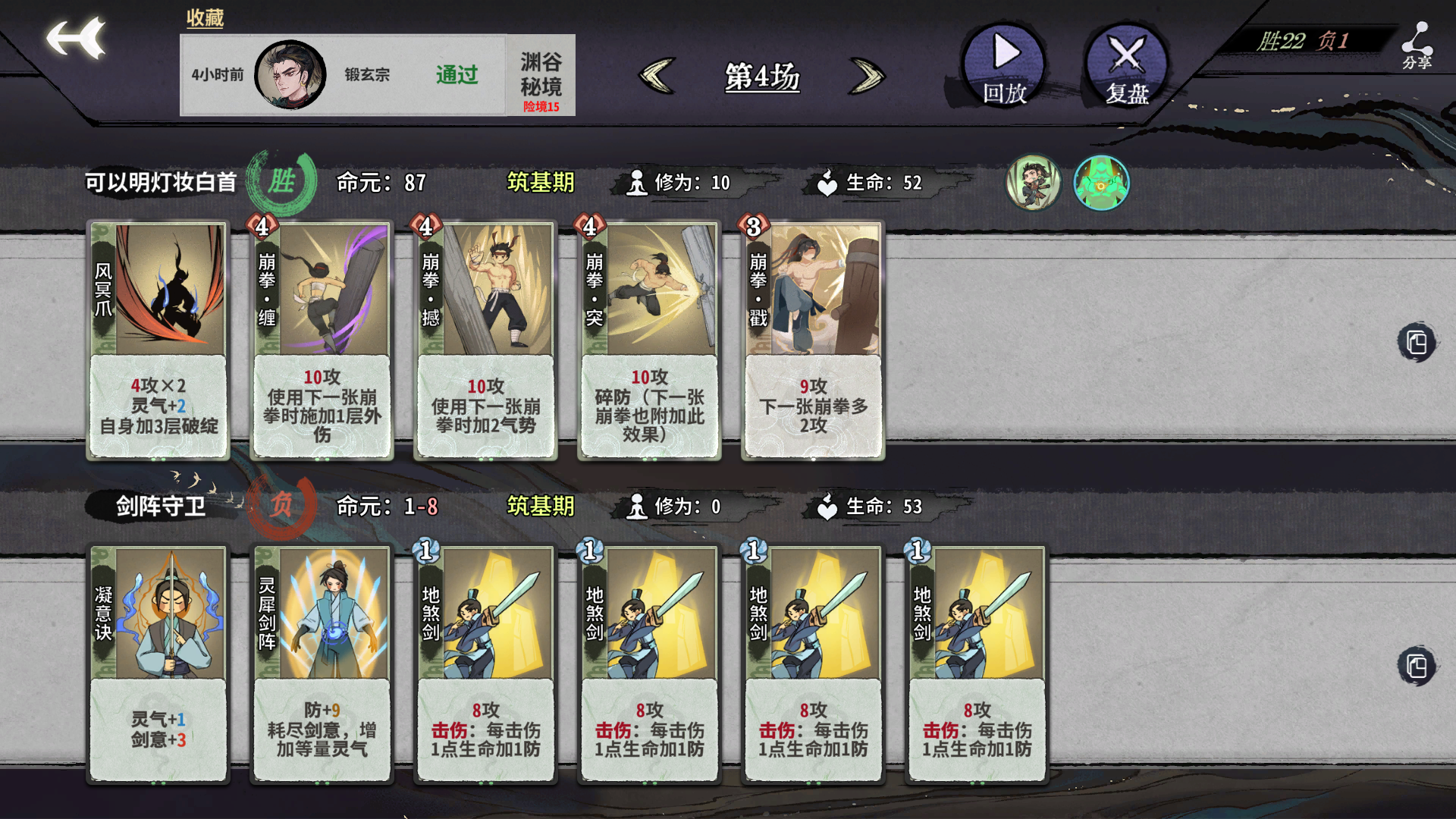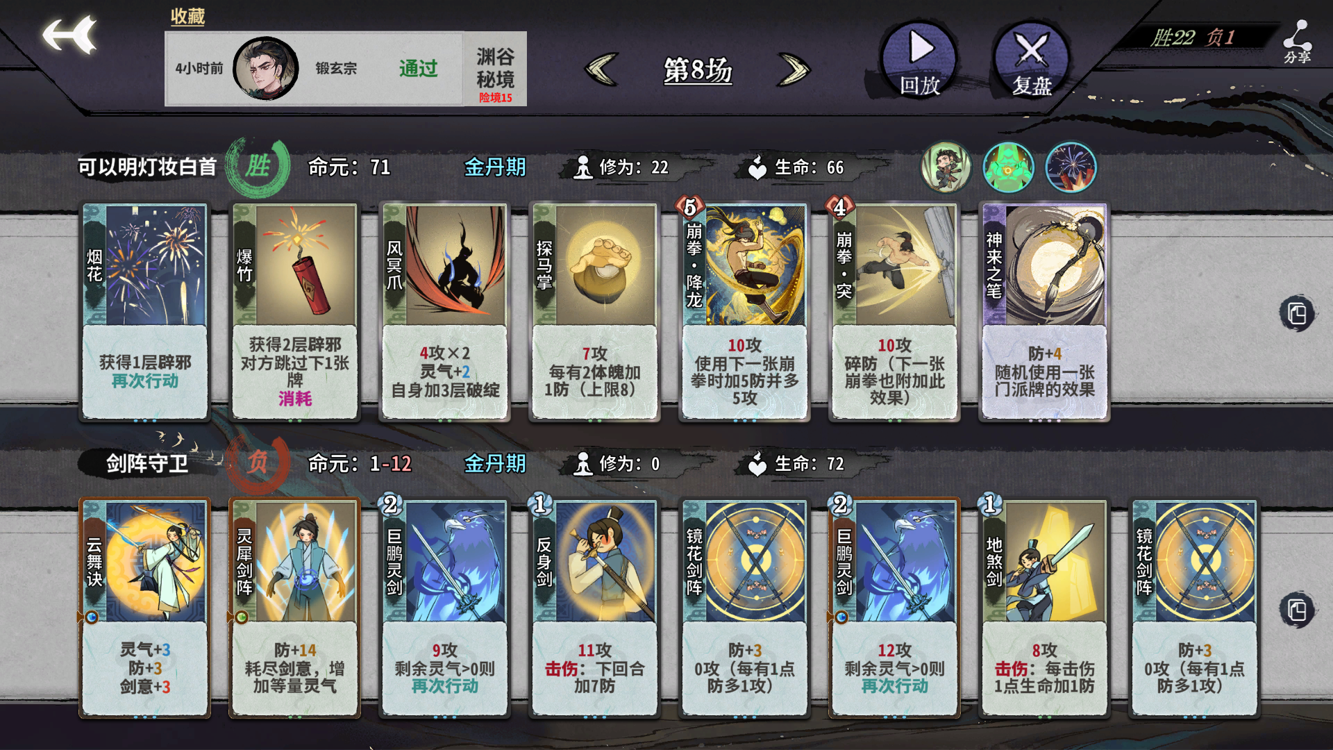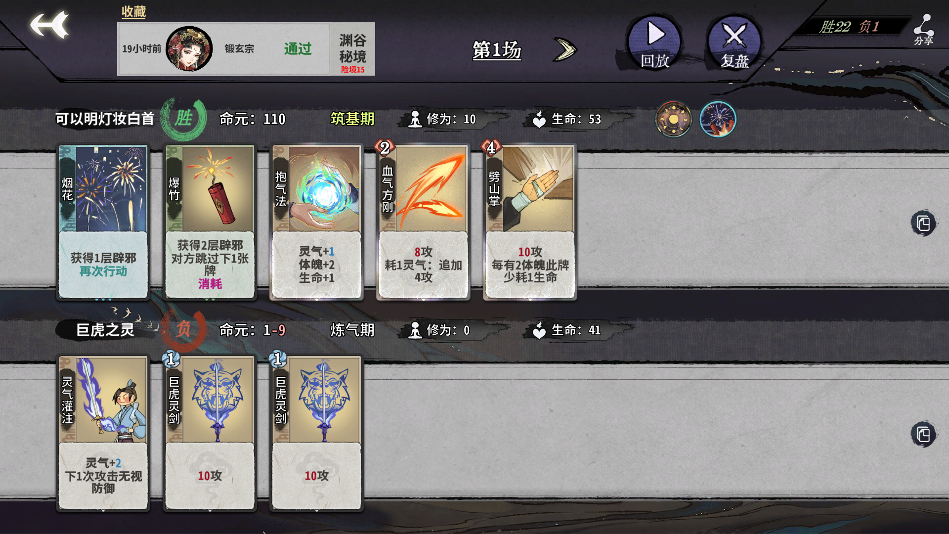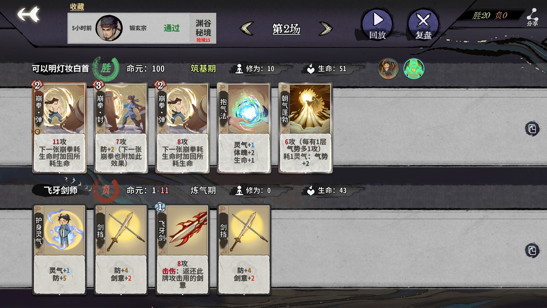 李㵘的先天仙命使得我们能够快速补体魄,故同样在前期不着急锻体,以赢为主,能赢再锻。但是不点化神仙命灵气会自动转为体魄,在金丹元婴期我们可以选择的卡组反而较少,只能尽量以崩拳、迎风等卡组进行过渡了。