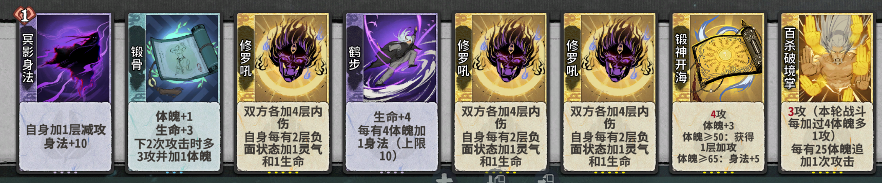 2.由于每次突破境界后,体魄上限都会被直接拔高到下个境界门槛,故在前期推荐锻体卡为:抱气法(筑基后期就能扔了,用不了几轮),锻筋(筑基金丹期可用来卡对面地煞等击伤,用不了几轮),锻骨(又能锻体又能加伤,优质锻体卡),锻神开海。基本上荷重和锻髓只在特定需要打长线或卡击伤的对局才会使用。