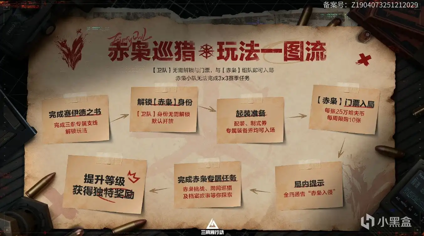 首先是玩法一图流,要做三条不同支线任务才可以解锁[赤枭]身份,进行“赤枭寻猎”模式
