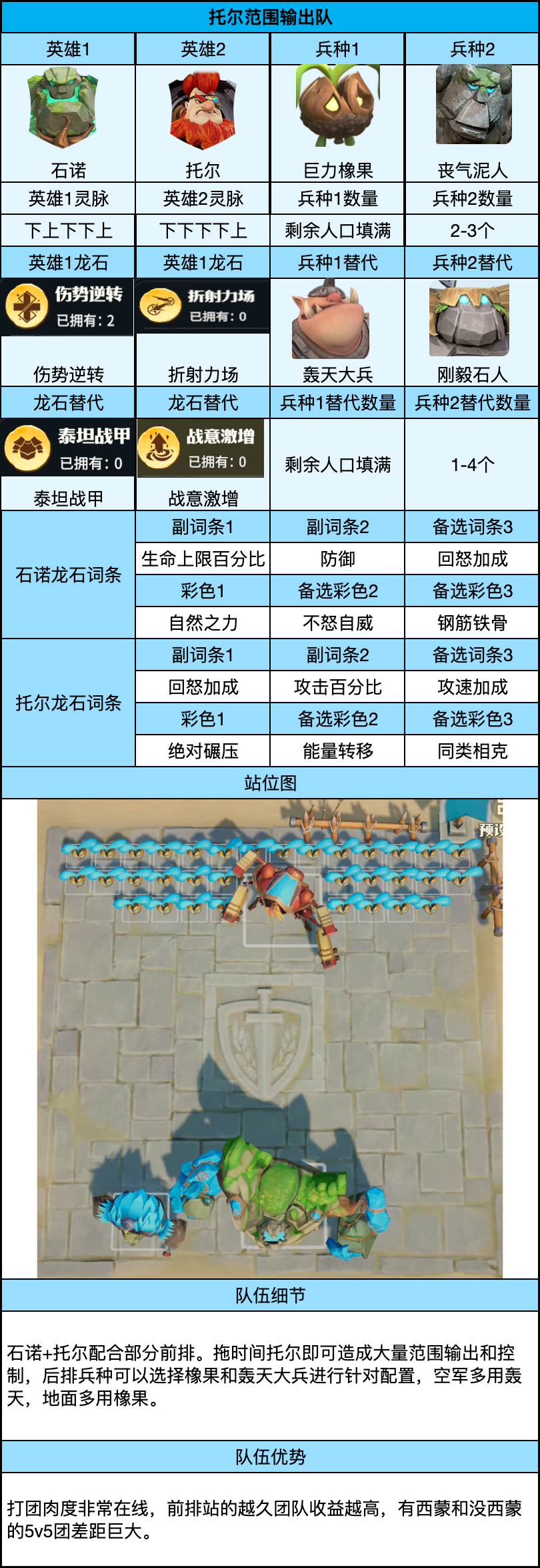 本套阵容队伍英雄以神话以上为主,龙石要求5个专属以上的进阶版配置。该套队伍以1-2队强力单军队伍为主,其他为团战队伍。建议队伍配置为:托尔+石诺,西蒙+斯卡卡