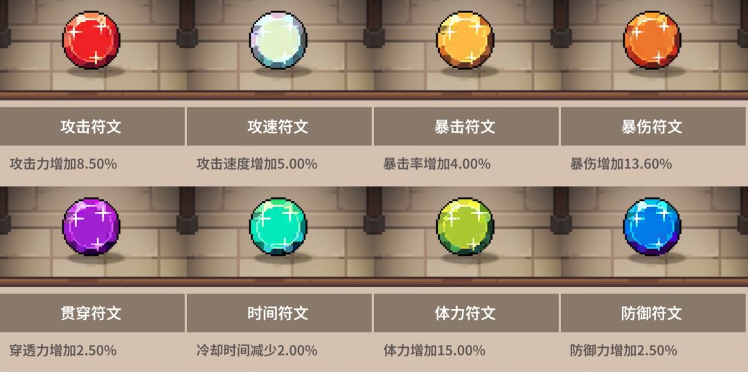 无名骑士团一共有八大属性:分别是体力、防御力、攻击力、攻速、暴击率、暴伤、穿透力、减CD。