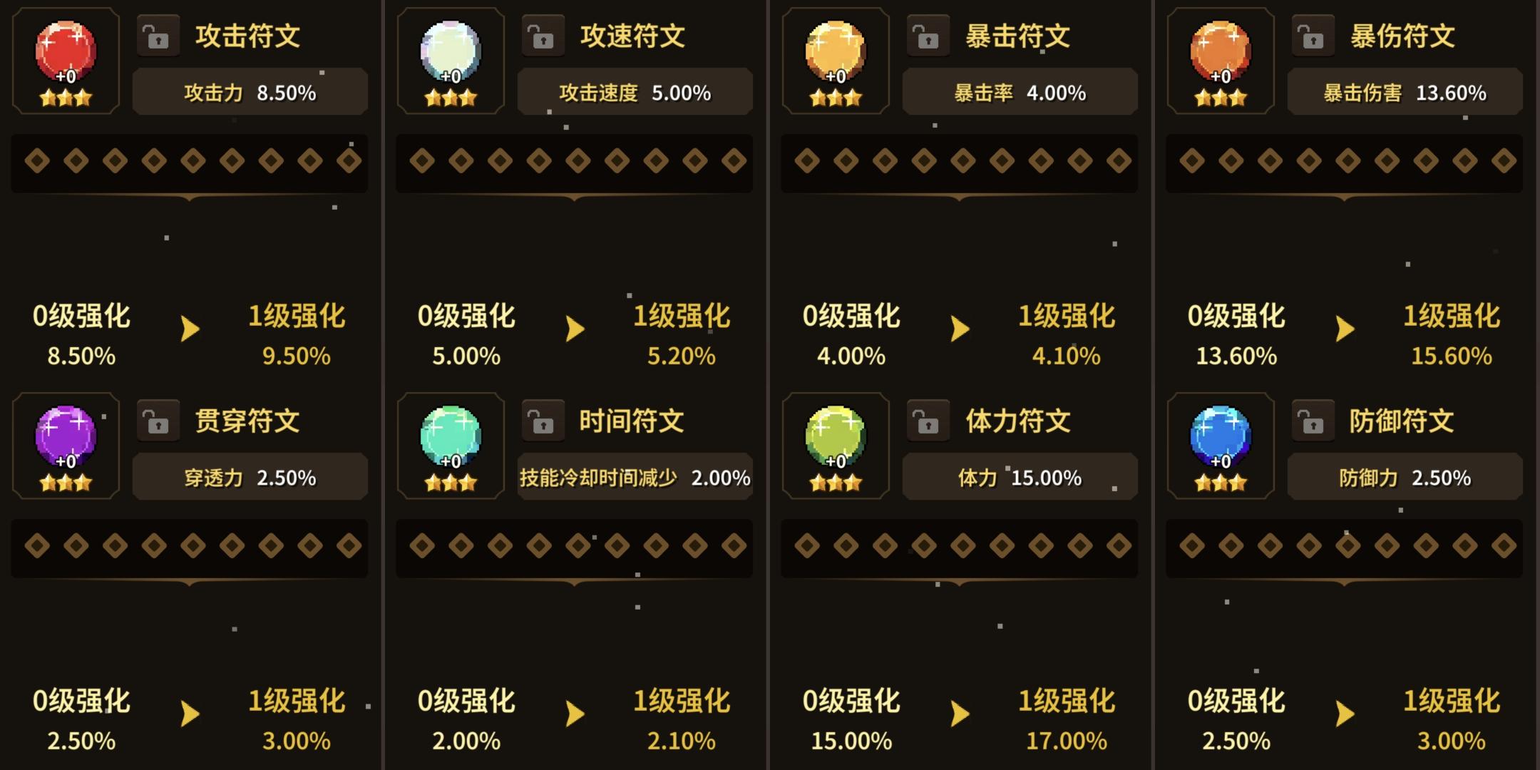 符文属性和武器词条都可以做全套,数值提升会非常明显。辅助必需全减CD,由于全增益的特殊性可以实现全流程覆盖。暴击率和攻速的提升幅度太小,不适合做符文。武器词条中的防御力和穿透力由于是具体数值所以完全不具备性价比。