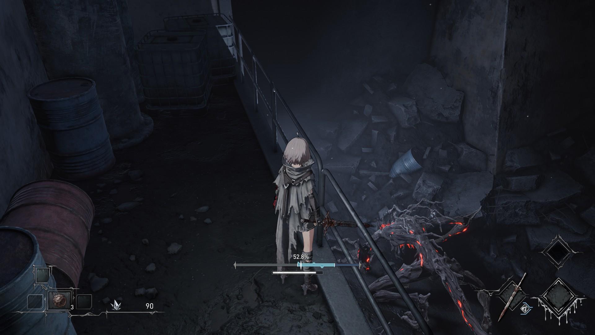 在动作设计方面,本作循序了轻击、重击、蓄力重击的设定,并通过三者的搭配,构建成各种伶俐流畅的连招。值得一提的是,本作只有闪避,没有招架,并不鼓励玩家进行站桩输出。但是闪避没有气力条的的限制,冷却又短,翻滚距离又远,确实是非常好用的。