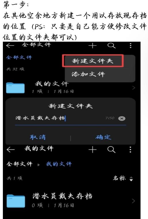 在其他空余地方新建一个用以存放现存档的位置(PS:只要是自己能方便修改文件位置的文件夹都可以)