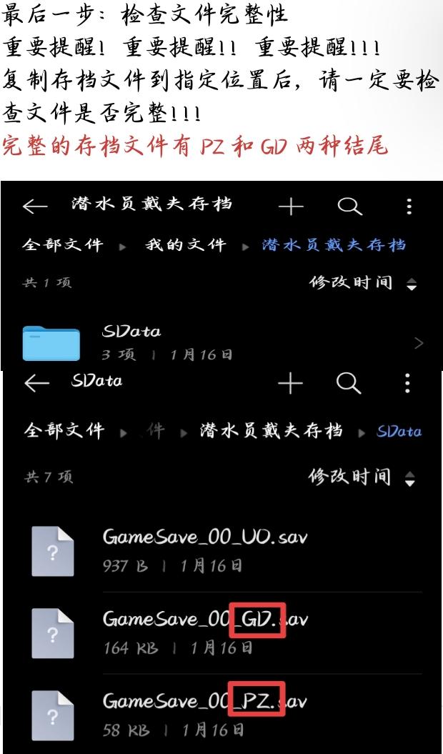 复制存档文件到指定位置后,请一定要检查文件是否完整!!!