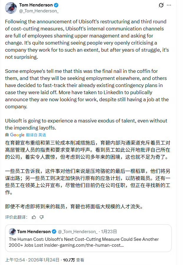 “一些员工告诉我,这件事对他们来说是压垮骆驼的最后一根稻草,他们将另谋出路;另一些员工则决定加快执行原有的应急计划,以防被裁员。还有一些员工在领英上公开宣布,尽管他们目前仍在公司任职,但正在寻找新的工作……即使不考虑即将到来的裁员,育碧也将面临大规模的人才流失。”
