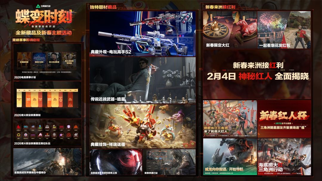 烽火地带全新玩法及地图焕新、全面战场更身临其境的战斗体验、多款独特题材藏品即将上新。此外,2月4日还将有神秘红人全面揭秘新春福利!