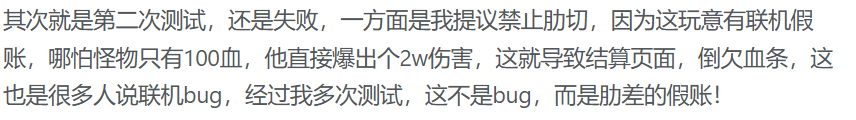 有没有一种可能,就是原版都能100血打几千几万血?联机bug是怪死了还是能吃伤害的问题,是“ 死了 ”还能吃伤害的bug,那你说这打出溢出伤害是bug的话,那谁能秒得动boss呢?。至于多次测试,我不免以最大恶意揣测,他肯定是不玩肋差打不出来输出,玩肋差打出来输出就说肋差有假账。