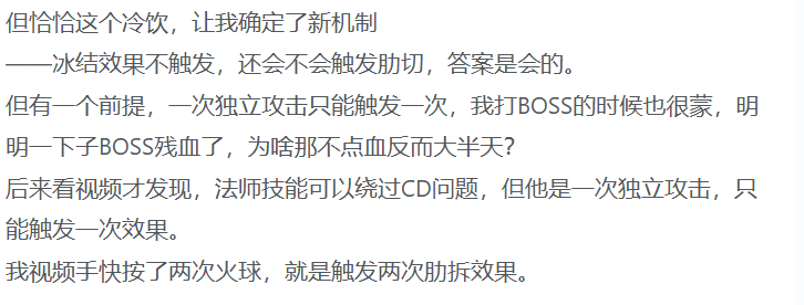 最后就是一个冰地雷法伤害结算:15*1.3*4.5*2*1.55*2.6*2.89*1.66(从零开始的暴击脆导致平均脆化增伤等效1.66)=1174.06,碎骨刀出伤:1174.06/2*1.55*2.6*2.89*2(出伤延时,地雷把脆化打满了)=13,673.9,总出伤为1174.06+13673.9=14848*16=237568,若计算爆燃效果,则追加1174.06*0.3*1.55*2.6*2.89*2*16=131,269.7,总伤就是368,837.7。仅仅两个道具+1碎骨刀伤害就如此惊人,这还是无霜冻的,有2霜冻,碎骨刀伤害要乘以4,直接打54,695.6白字出来。