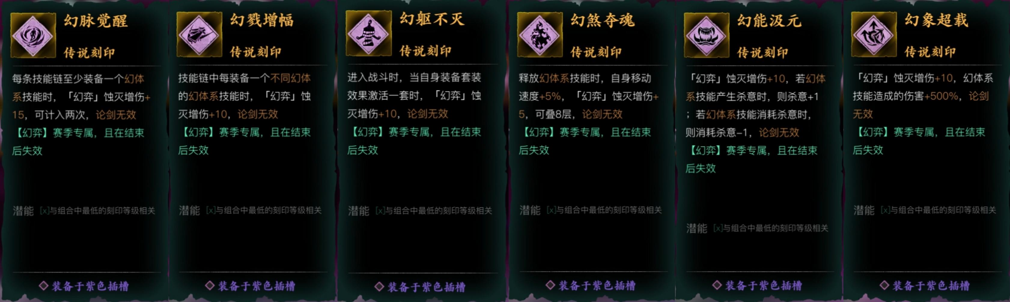 流派1:依托于原本技能链,只用一到两个幻体技能去替换原本技能链中的基础技能,嫖到部分刻印加成。这里大家视自己技能链而定即可,刻印不带幻象超载和幻煞夺魄