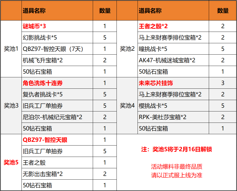 奖池中还有一些“常客”,其中包括50钻石宝箱、各类武器宝箱、赛季排位宝箱、挑战卡、王者之骰等等。本期奖池还特别给到了谜城币,这是谜城藏宝阁的专属代币,可以在谜城藏宝阁活动中兑换RGB骇客和不屈老兵系列皮肤。值得注意的是,2月6日谜城藏宝阁开启,会有新款皮肤——屠龙-RGB骇客首发登场,各位看官可以留意一下哦~