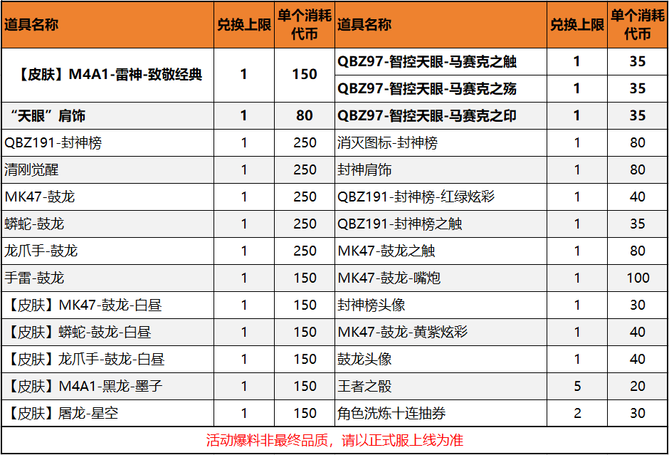 首发的道具还有“天眼”肩饰、QBZ97-智控天眼-马赛克之触/殇/印;返场了QBZ191-封神榜和MK47-鼓龙(含套装),以及它们的一些万化;还有切刀非常帅气的清刚觉醒。当然,返场内容非常丰富,大家可详细查阅下表: