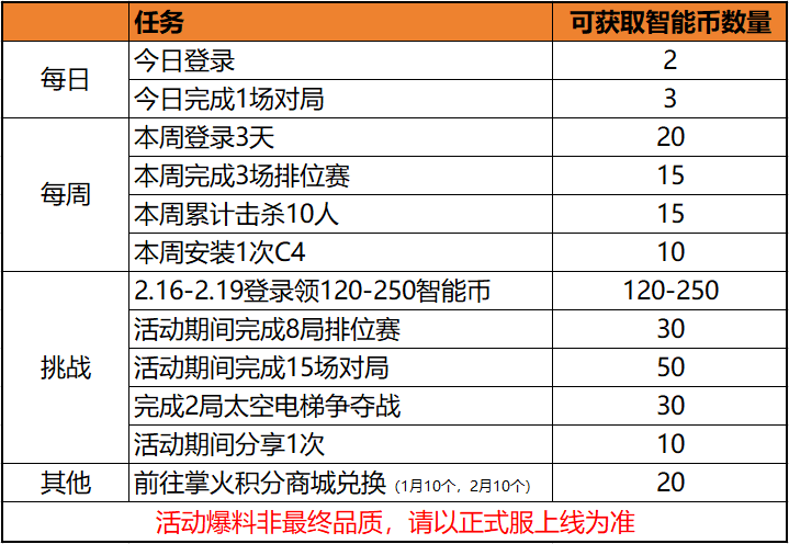 经过计算,在活动期间内完整完成上述任务,可以获取1000+枚智能币,足以抽完奖池并兑换智能币商城首发道具与消耗类道具。获取智能币途径非常多哦~
