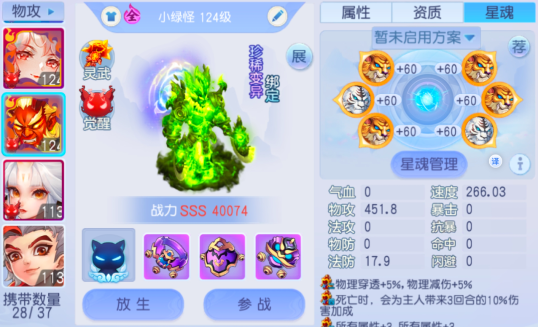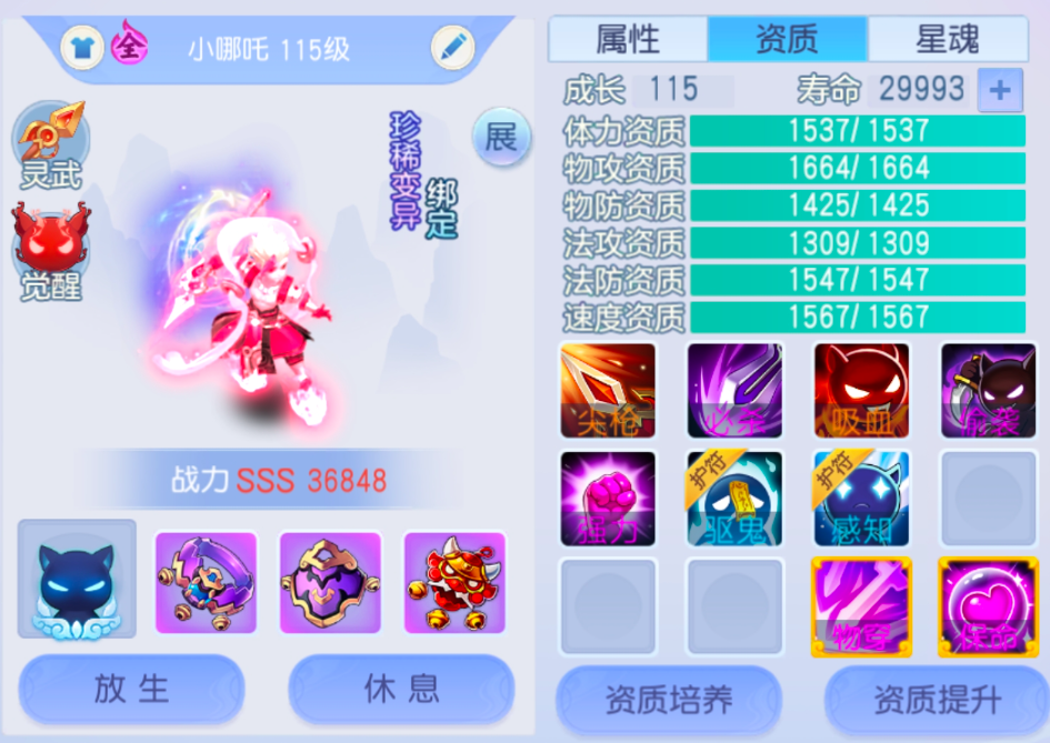 星魂首先属性上,优先选择力量、物攻、敏捷、速度,这4个属性完美贴合灵珠子所需。