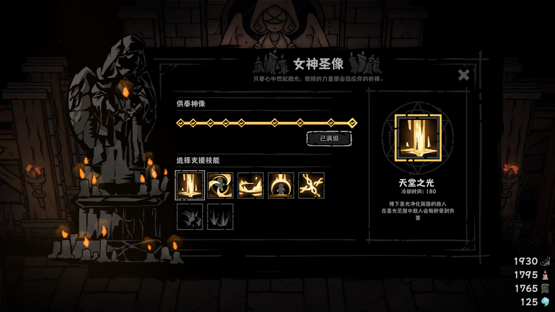除了角色的技能,游戏还拥有支援技能,我们可以在女神圣像处,选择一个自己喜欢的技能,来进行学习,推荐学习纯洁圣盾,可以使自己无敌一段时间,非常好用,无敌是多么的寂寞!不过这些支援技能冷却时间都非常的久。