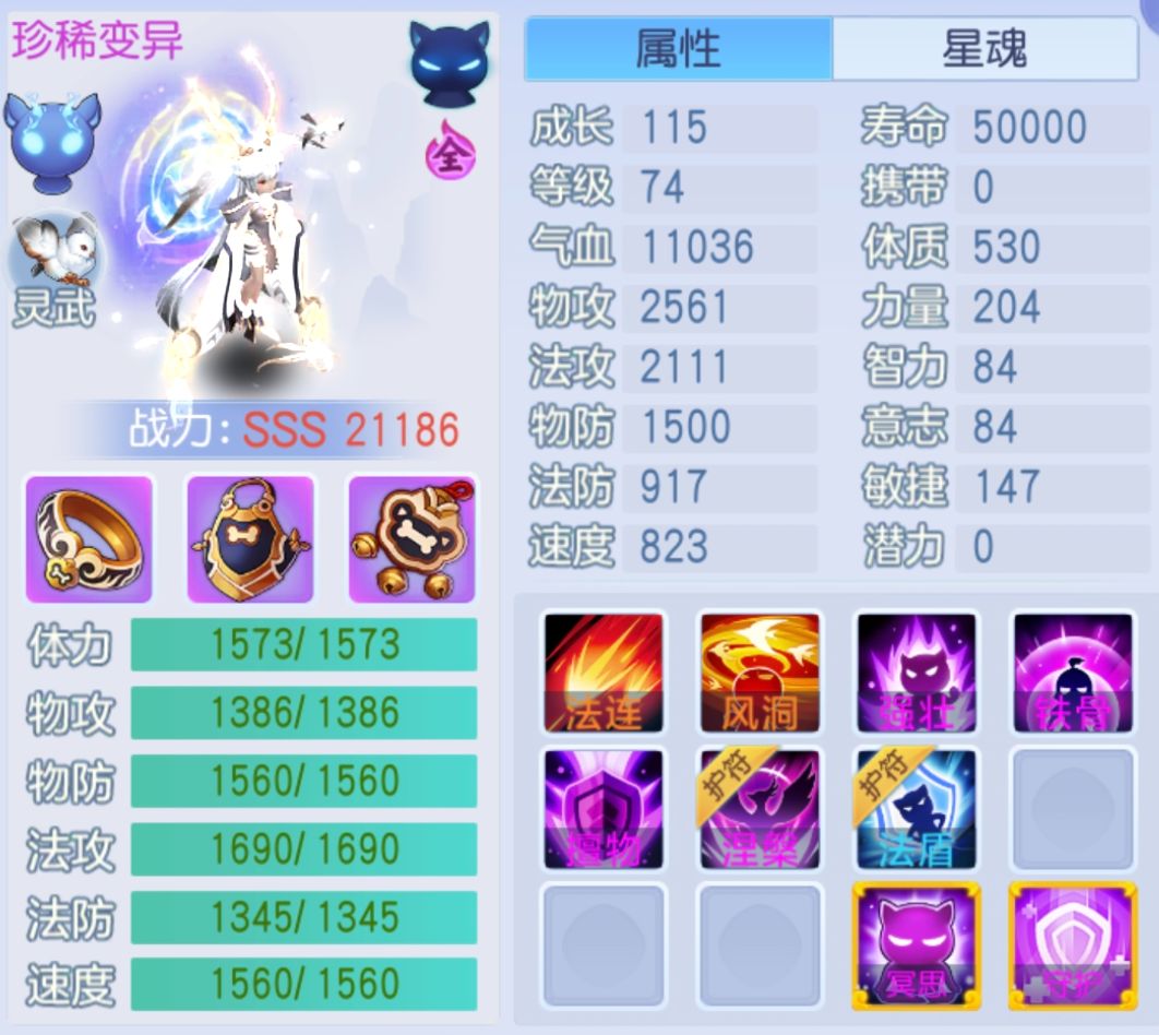 成长115全满,体力、物防、法攻、速度全满,法防稍欠,但整体资质特棒。