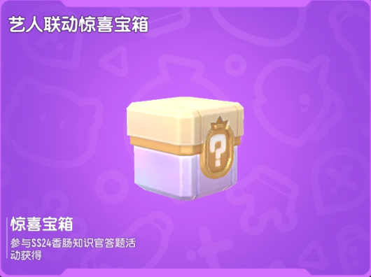 开启艺人联动惊喜宝箱可获得【拉美卷】联动头部、【邓典果斜挎包】联动外套、【安全帽】联动头部、【卖烤肠】联动气泡表情、【斜刘海】联动头部、【李文polo衫】联动上装