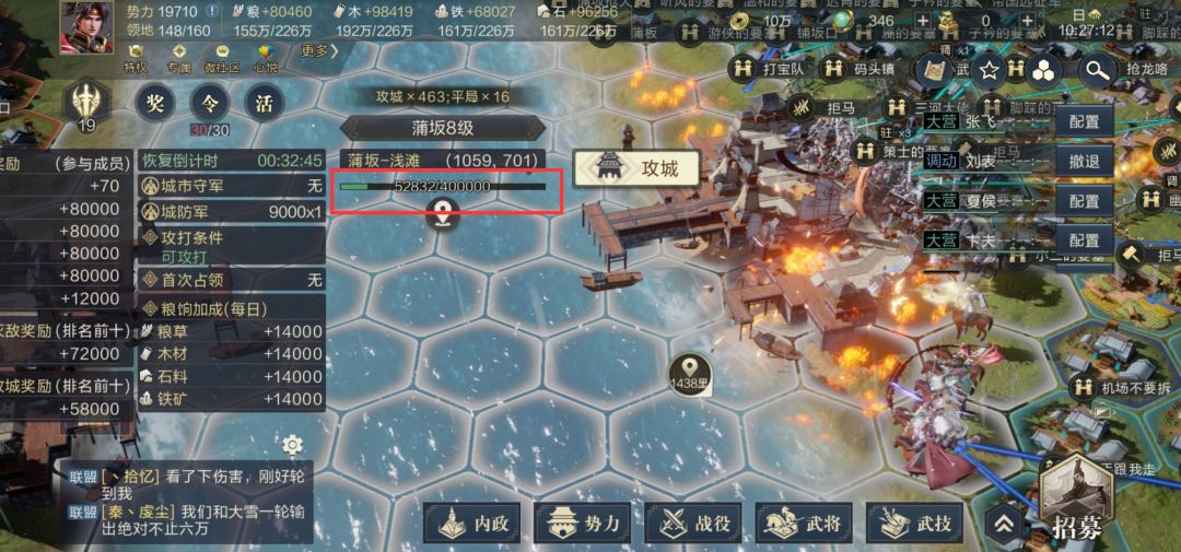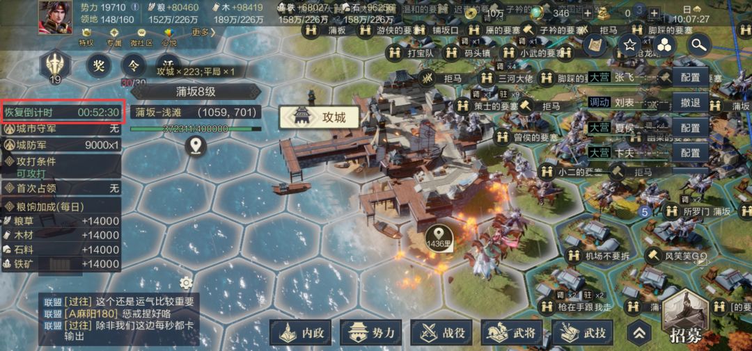 2、城防值每5分钟结算一次,如果你是指挥,你需要看好你们打的关隘或者城池的总城值,然后,如果你们是先手打的那一方,那么你就要计算好在守军全部击败之后,每5分钟城防值能掉多少。如果你是后手攻击的那一方,那么你就要计算对面每5分钟能打掉多少城防值,卡在最后一波城防值结算5的分钟或者10分钟的时间点上,把自己联盟全部的拆迁队派遣过去赌最后一下。