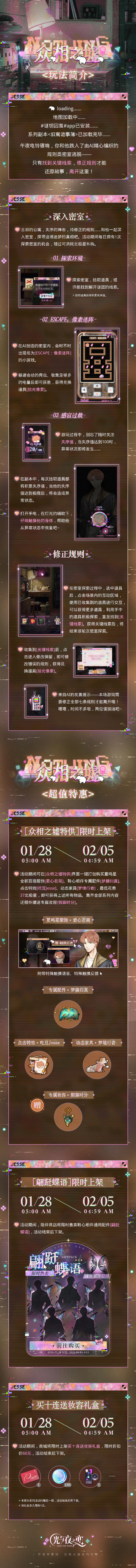 活动说明:与夏鸣星一起修正错误的规则,逃出险象环生的密室吧。参与活动即可体验专属剧情,获得活动限定[3星]灵犀 夏鸣星・妄迹为真、专属头像框、朋友圈封面等奖励。