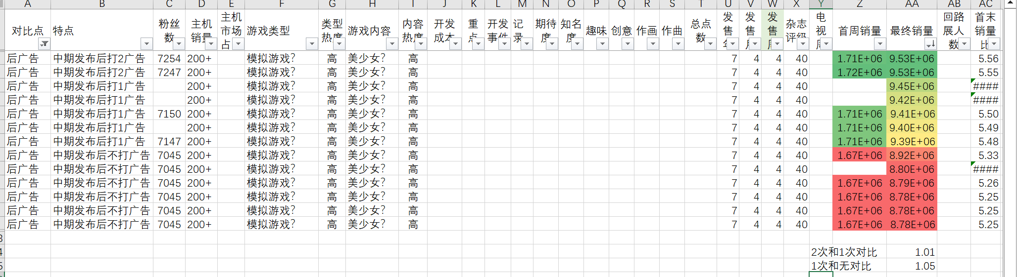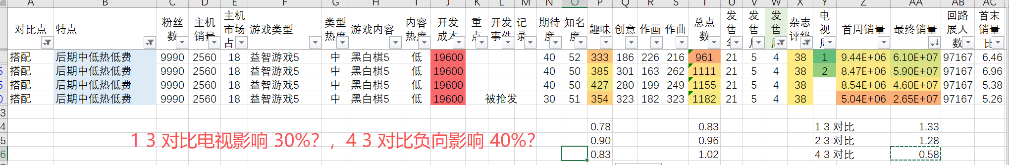 对比说明:21年3月3日开发,分别对比不同杰作搭配,想看看热度和费用对销售额影响