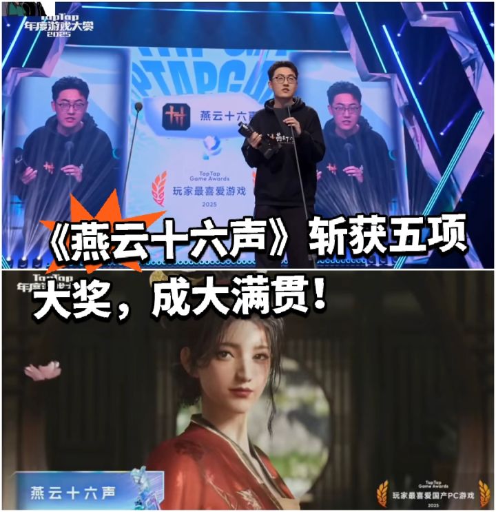2025 TapTap年度游戏大赏颁奖典礼于昨天2026年1月24日晚圆满落幕,而在昨天晚上揭晓的2025年度TapTap游戏大赏获奖名单中,《燕云十六声》成为最大赢家,一共获得五项奖项,包括由专业评审评出的“最佳游戏”、“最佳叙事”、“最佳声音表现”,以及由玩家投票选出的“玩家最喜爱游戏”和“玩家最喜爱国产PC游戏”,是颁奖礼上名副其实的“大满贯”啊。