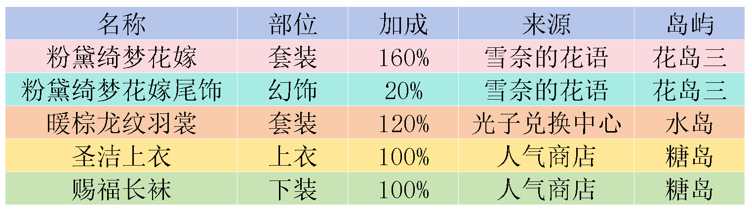 图3.2列举了一些可以免费获取的高移速加成服饰。同时穿着”圣洁上衣“、”赐福长袜“、”粉黛绮梦花嫁尾饰“可以达到当前版本最高移速: