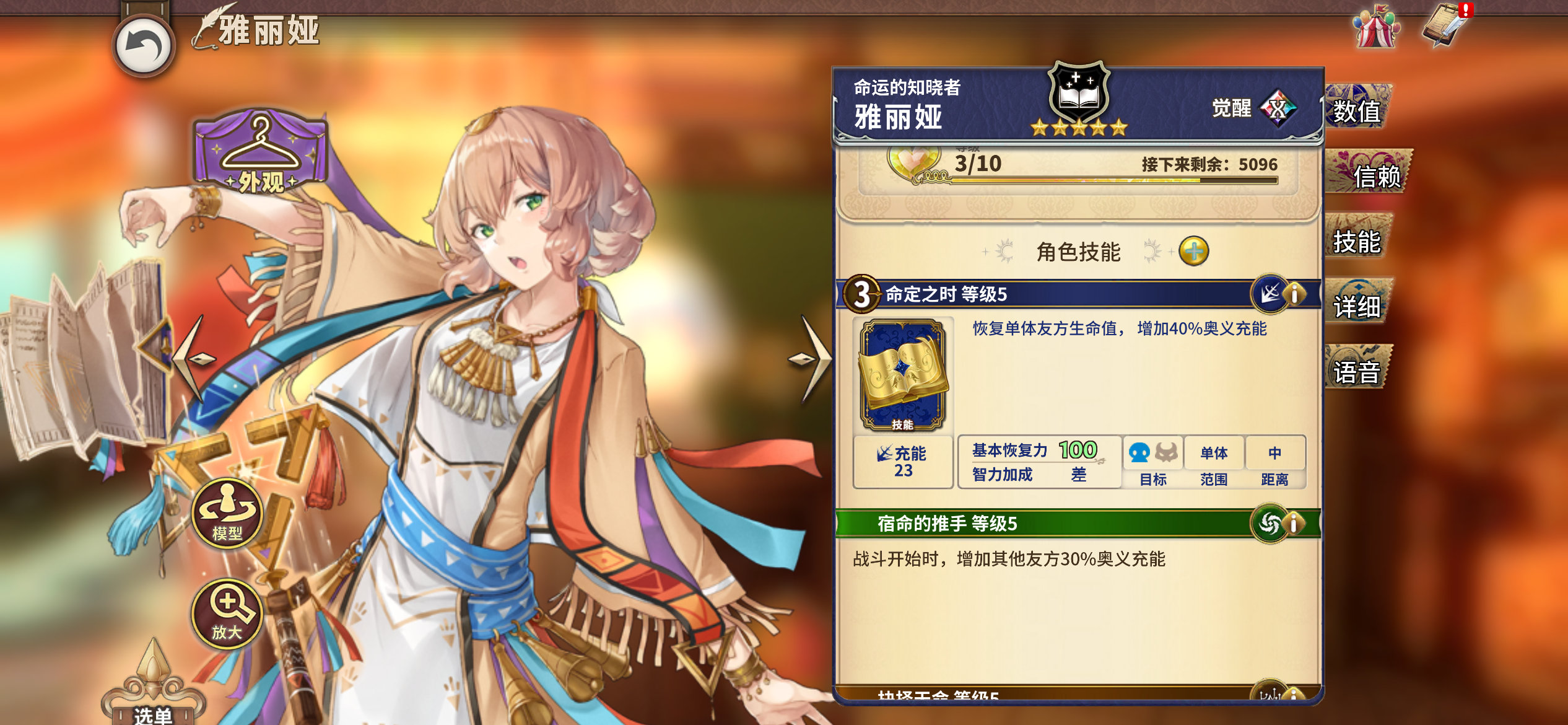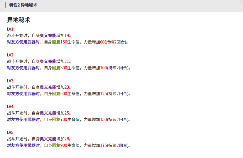 在觉醒强化之后,特性2会提高自身的回复值(1080)以及力量值(350)并新增奥义充能的效果(4觉+1,9觉+2)。