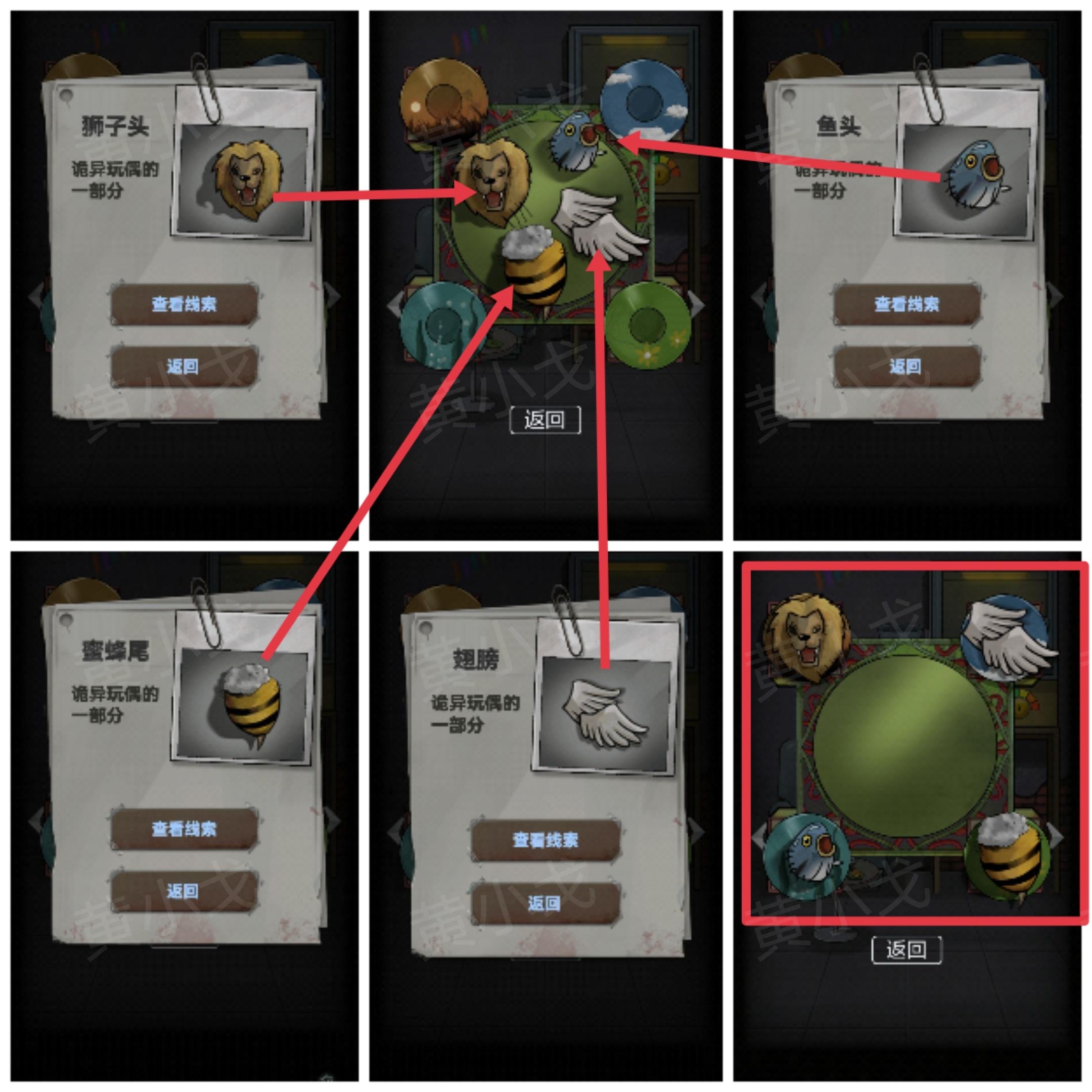 9.点击获取【狮子头】、【鱼头】、【蜜蜂尾】和【翅膀】;然后把四个玩偶部件放到印有对应景象的圆盘上