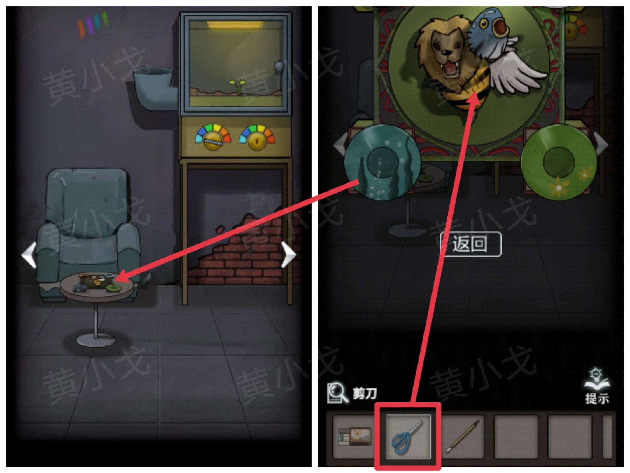 8.点击茶几上的机关,用【剪刀】将缝合起来的玩偶部件拆开