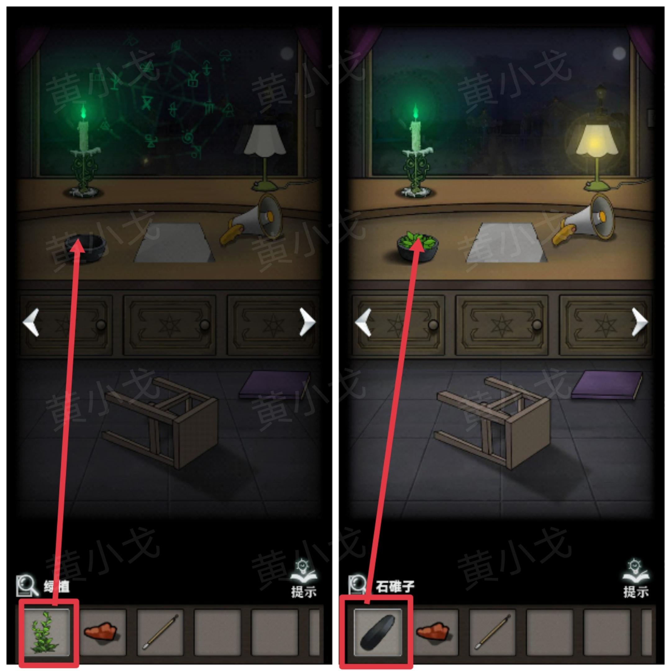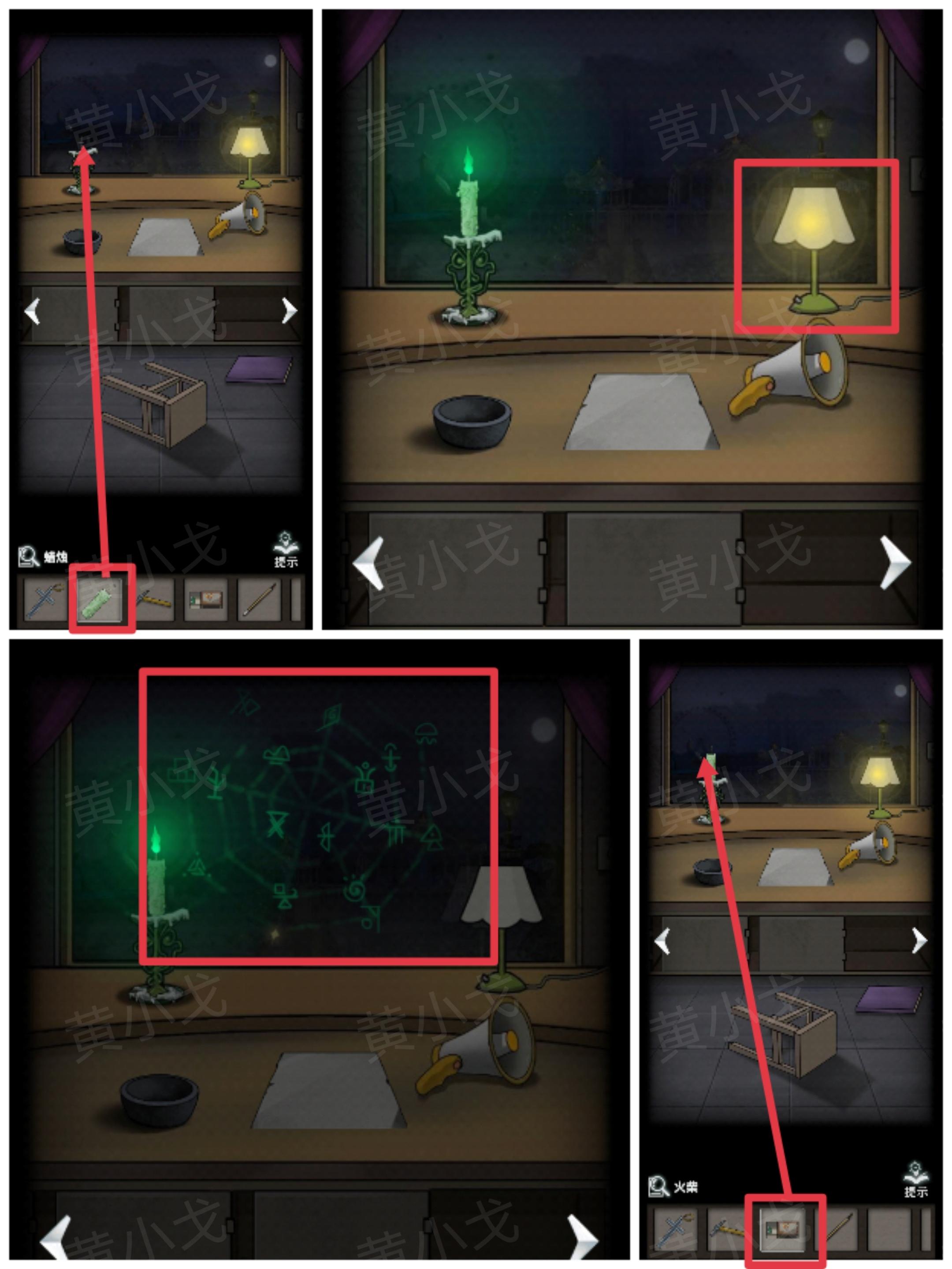 21.把【蜡烛】放到烛台上,用【火柴】点燃,关掉台灯,窗上出现很多符文