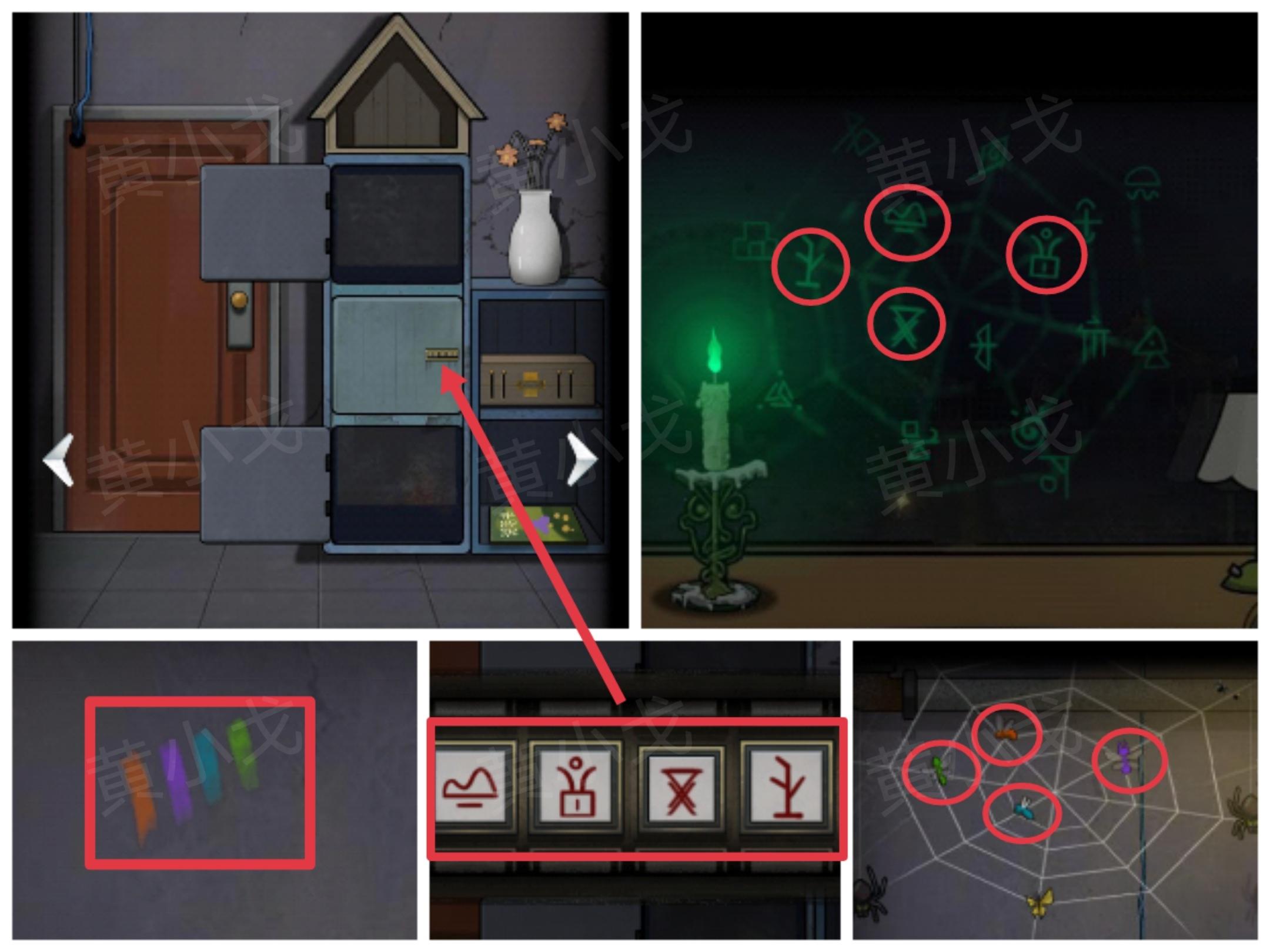 22.点击储物柜中间的柜子上的密码锁,根据[恒温箱]场景墙上的涂鸦线索、[窗户]场景窗户上的符文位置线索和[相机]场景蚊虫的颜色及位置线索,调整密码锁