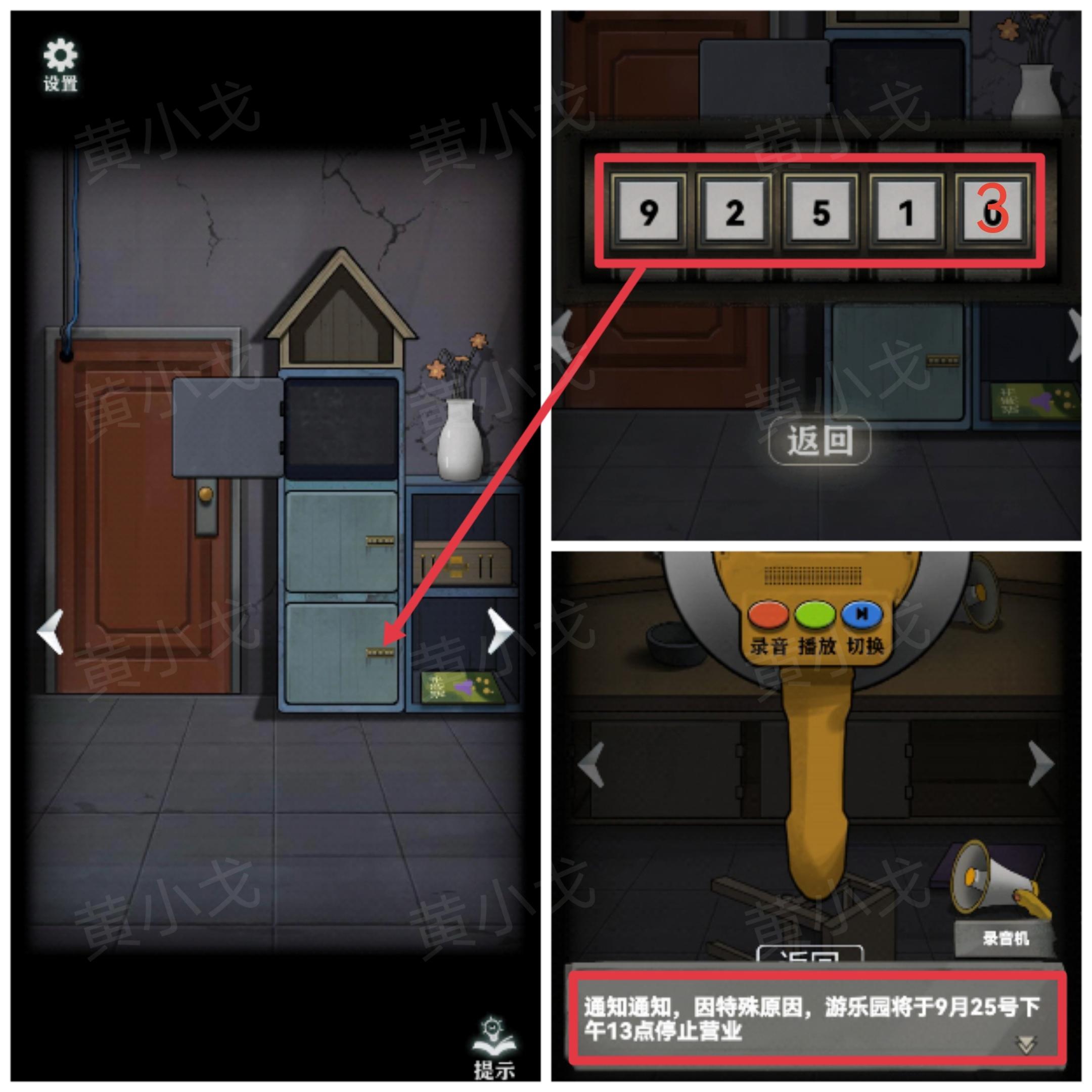 17.点击储物柜下层柜子上的密码锁,根据喇叭里的录音线索,输入密码:92513