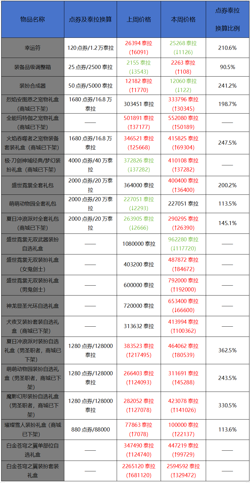 本周商城道具基本一片飘红,绝大多数商城道具价格都在增长,并且增长幅度还非常大,之前不被看好的安图恩宠物装备现在也已经翻身,后续价格还会持续增长