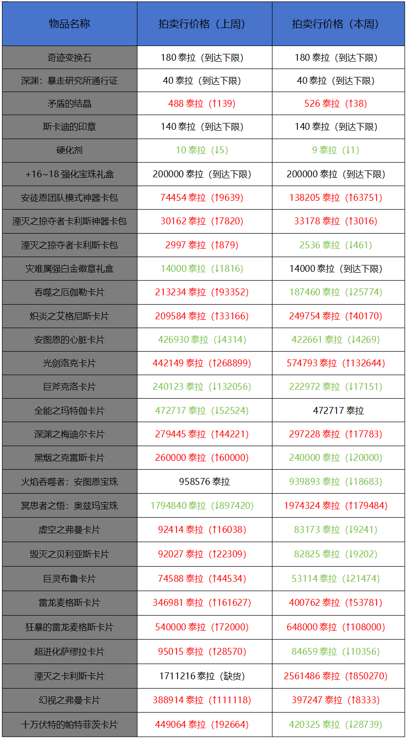 另外可合成附魔卡的价格在本周价格开始回落,反观团本拍卖附魔价格并没有受活动宝珠影响,相比上个版本价格还更高了,大概率是产出下降了,新版本至今笔者也只见过一次可交易附魔