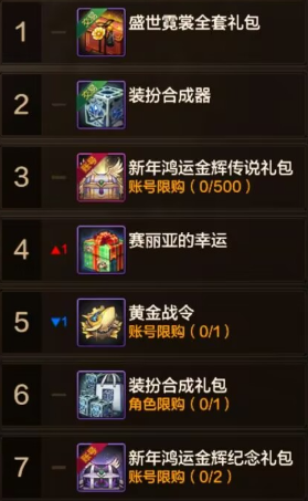 本周商城热门道具相比上周变化不大,春节套依旧是稳居榜一,唯一变化较大的就是新年鸿运礼包了,这个礼包正常来说随着时间热度会慢慢降低,但是现在由于白金天空价格大幅增长,有不少玩家都开始尝试开白金天空了,除此之外装扮合成器目前还受男圣职影响,热度很高。