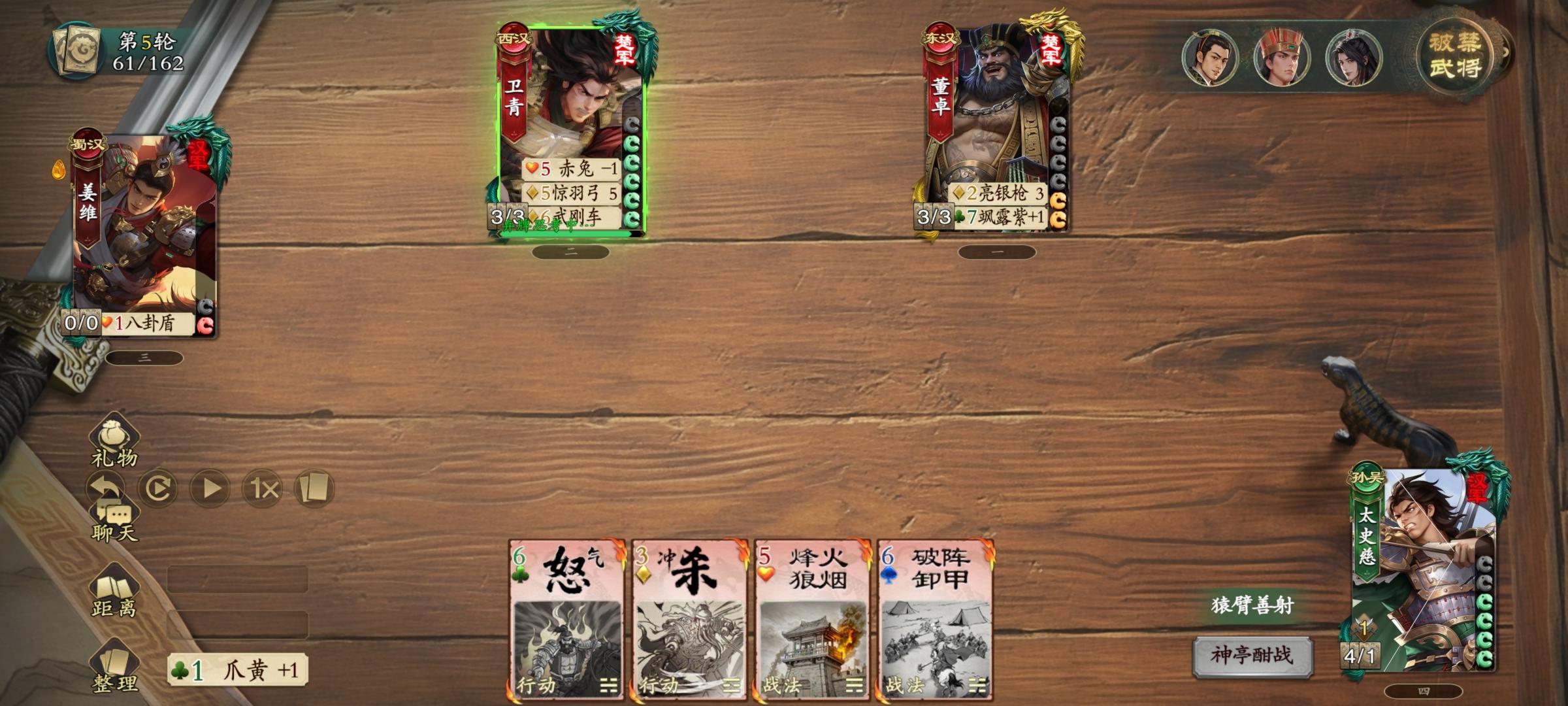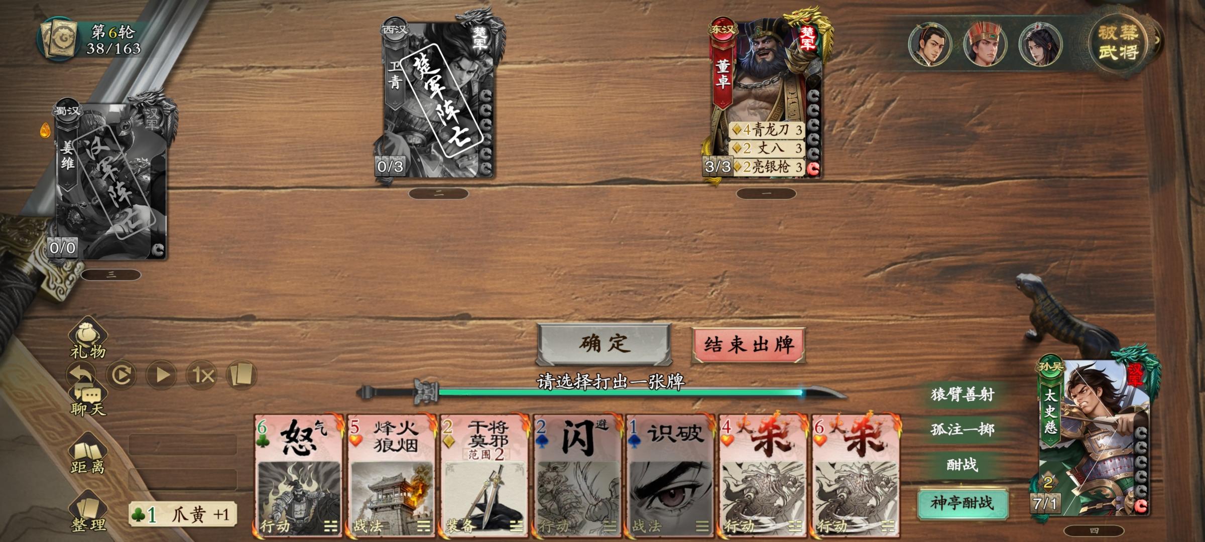 2.姜维回合,发动九伐共五张牌,对董卓使用天水麒麟儿