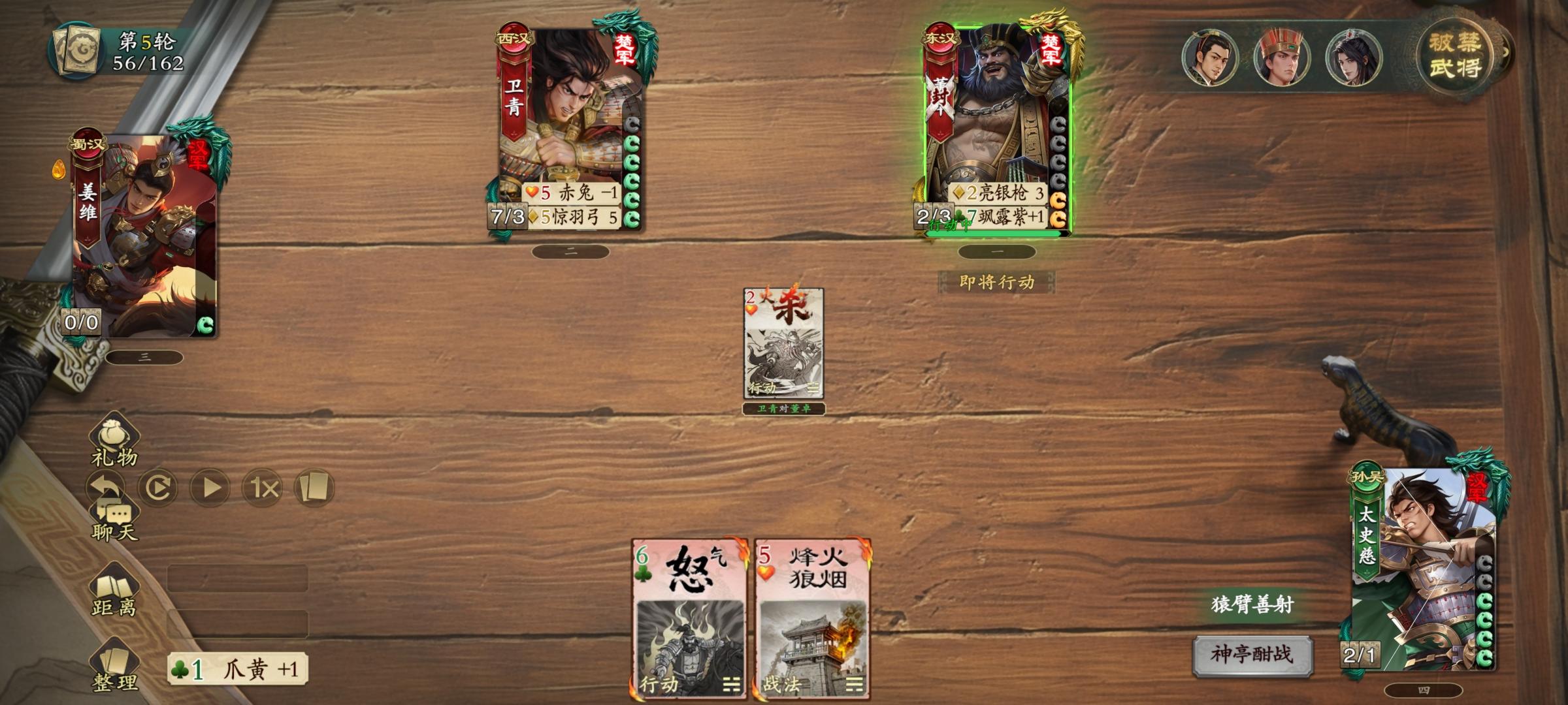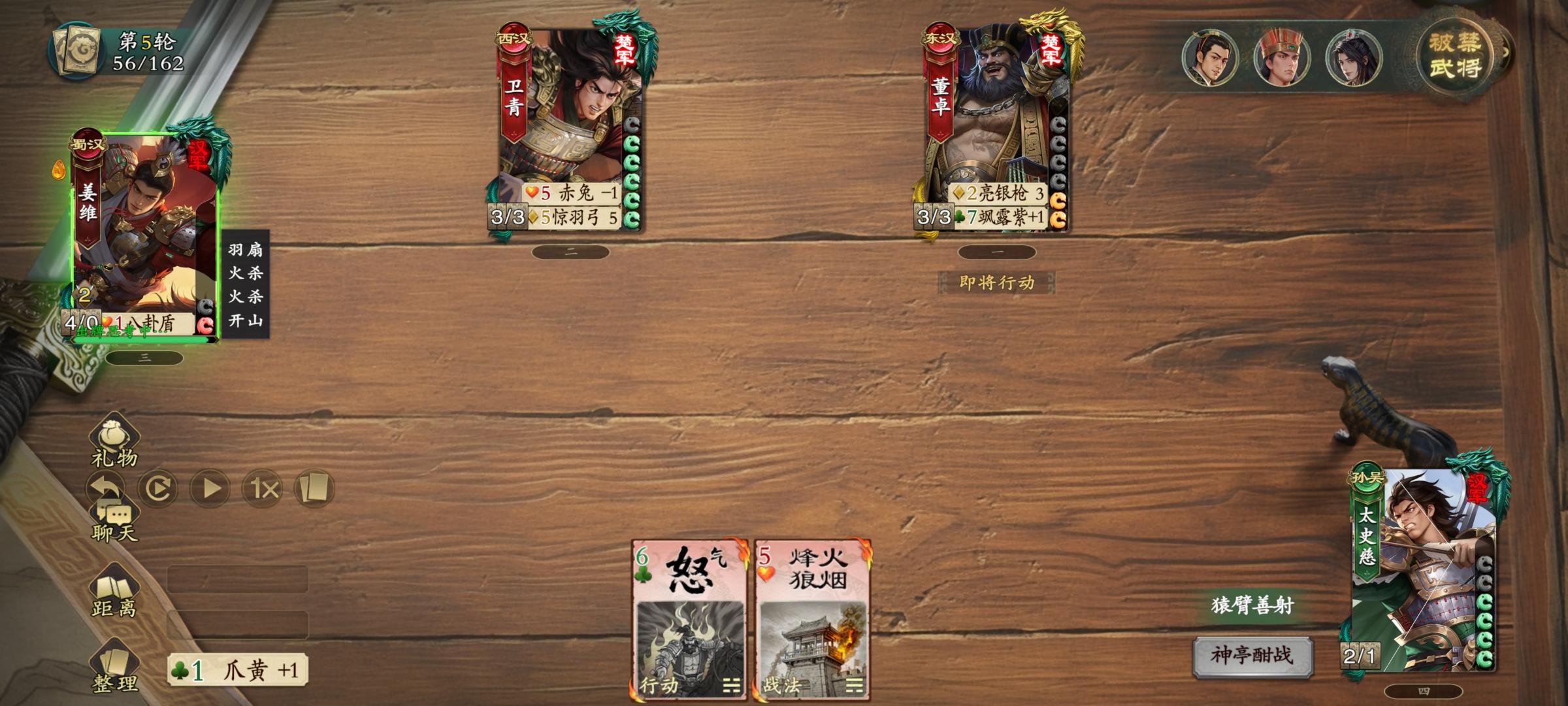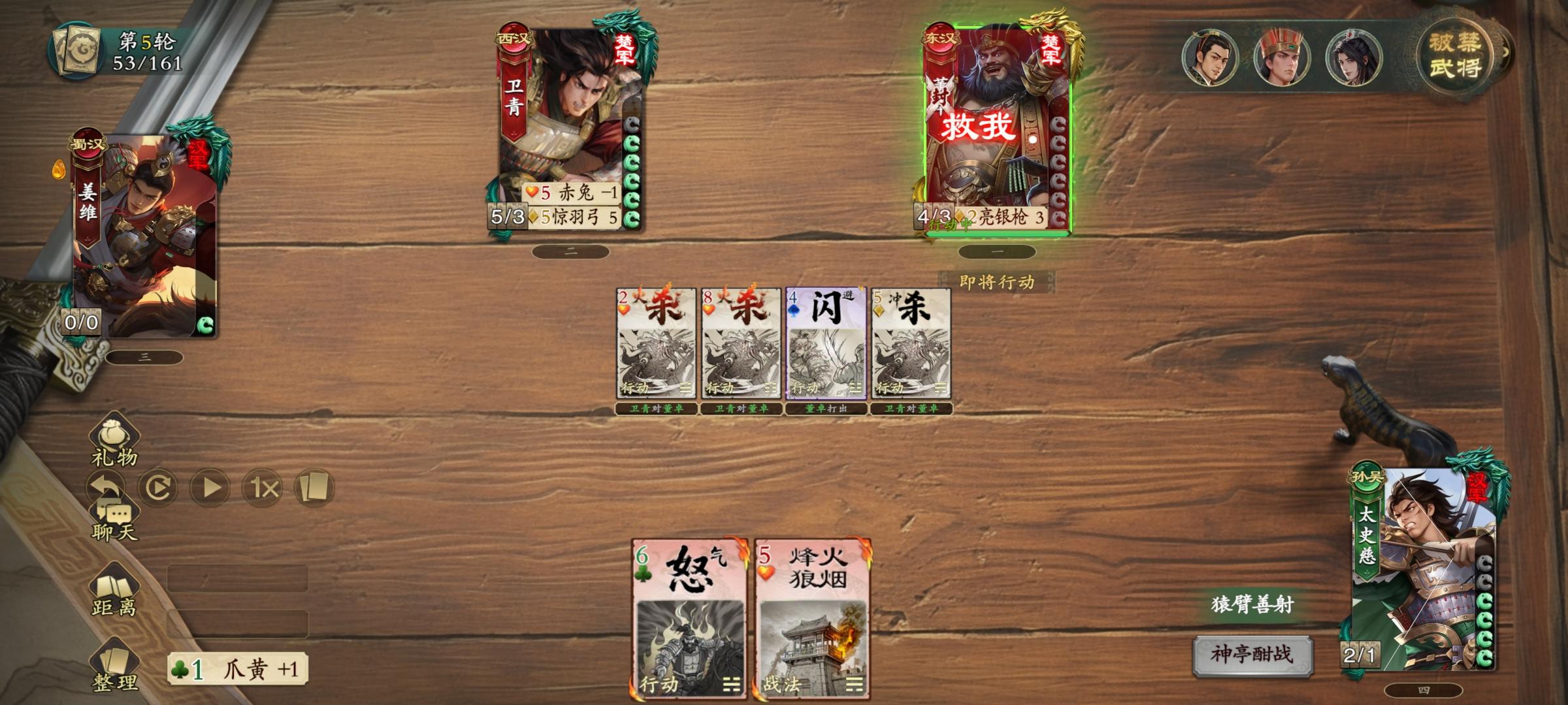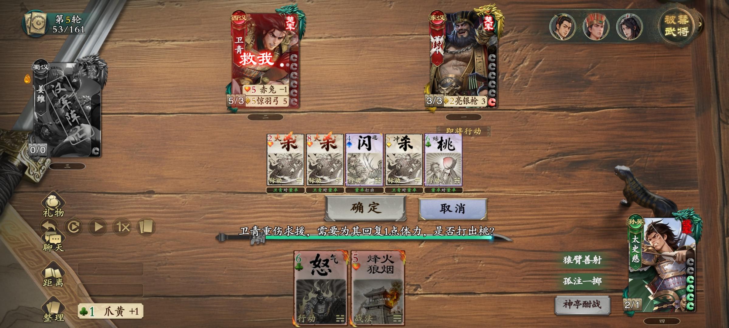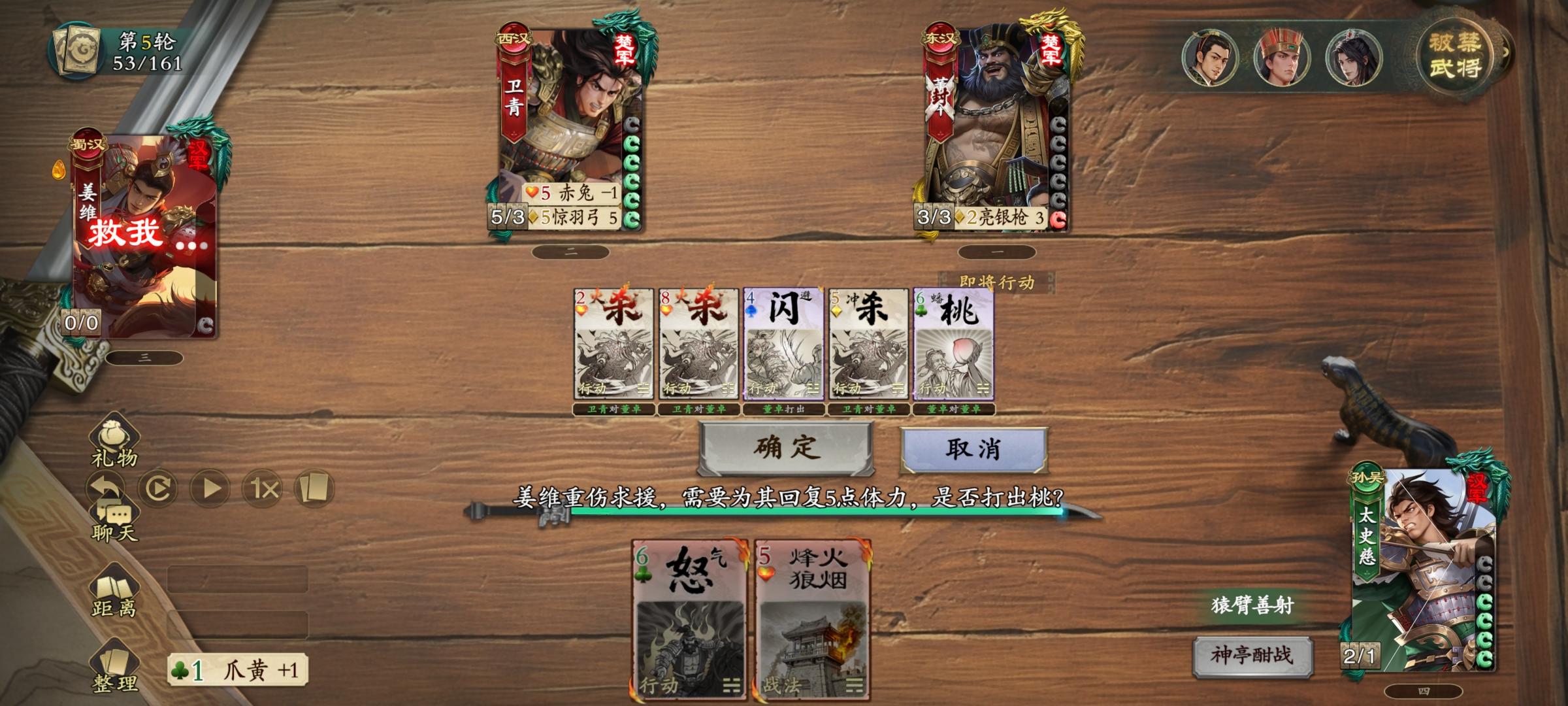 4.卫青剩下五张手牌,姜维掉五血,使命完成。