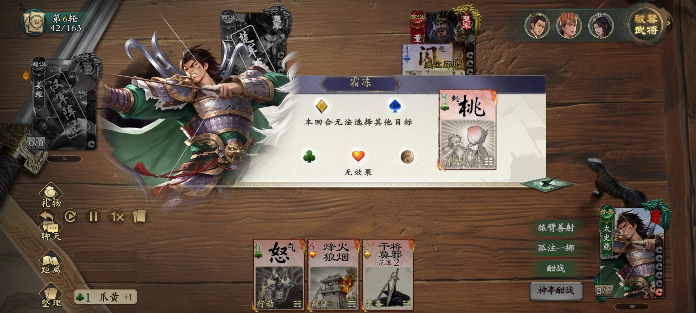 6.董卓回合,将太史慈打至1血,对太史慈用的霜冻没中