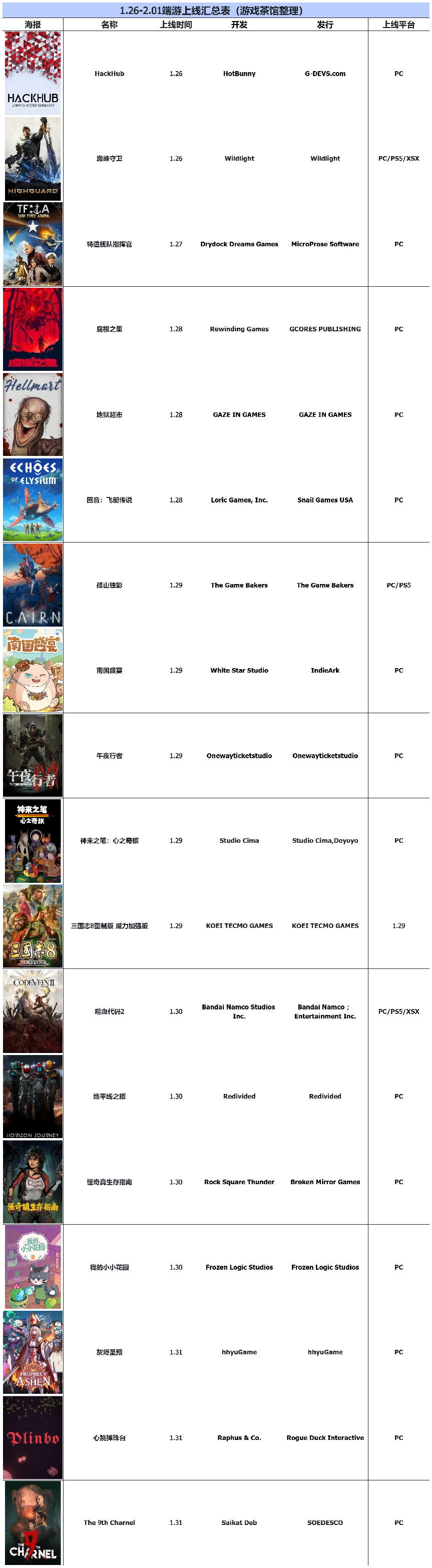 游戏茶馆整理了下一周(1.26-2.01)内即将上线的新游戏。