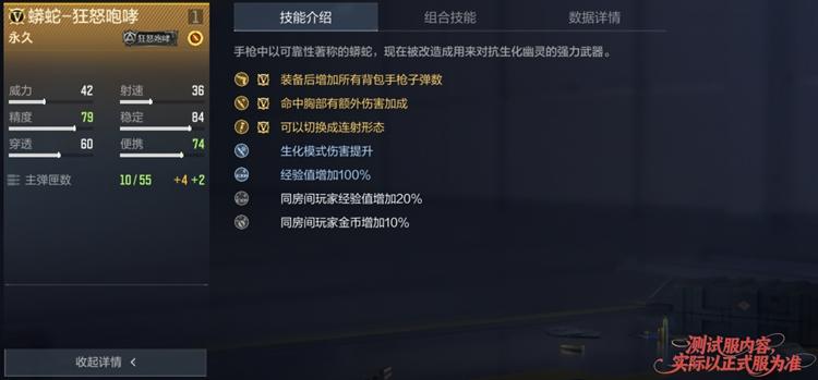 在技能上“蟒蛇-狂怒咆哮”拥有命中胸部伤害加成,这个所有蟒蛇系列副武器标配的技能,还可以切换成连射形态以及生化模式伤害提升的技能。