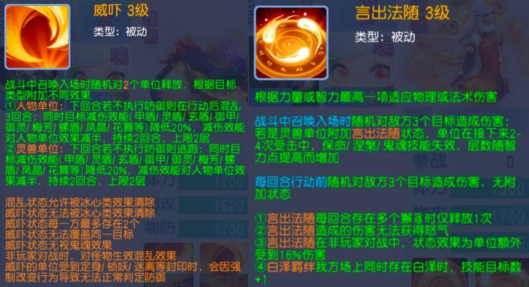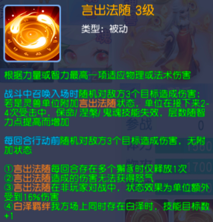 被动触发技能言出法随,有点类似于打上冲阵技能的宠物,进场会造成随机三个目标的攻击!并且对于宠物来说还可以附加言出法随的状态,导致宠物除了行尸以外所有的重生类型技能失效!并且在后续的回合中每回合还会释放一次,不过没有这个克制效果而已。