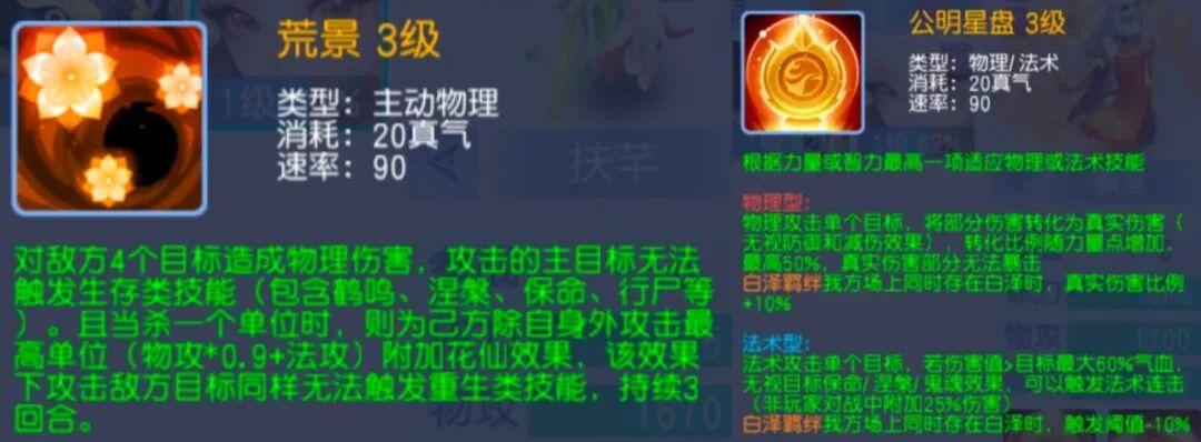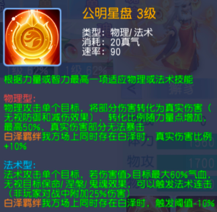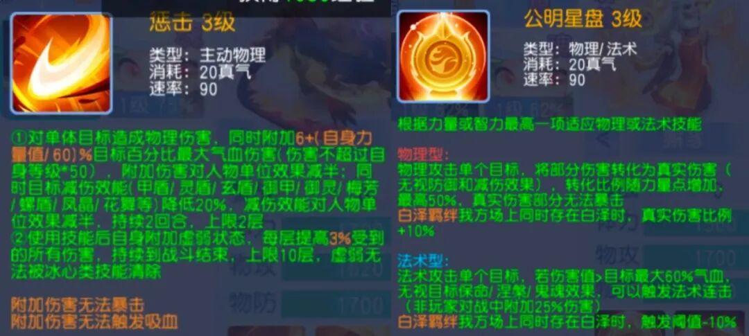 主动技能公明星盘,一个是物理单攻加真实伤害,另一个是单法自带克制,技能效果都是非常的强悍!选择物理和睚眦技能效果一样,选择法术无限堆高法术伤害,自带三克制!简直强无敌!