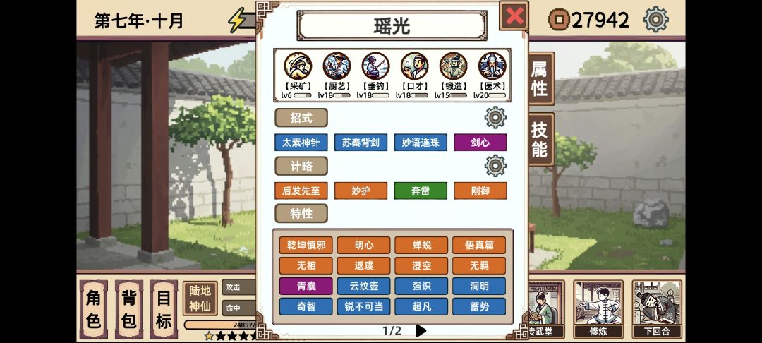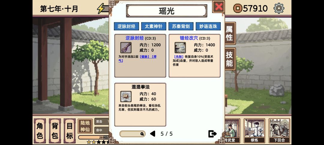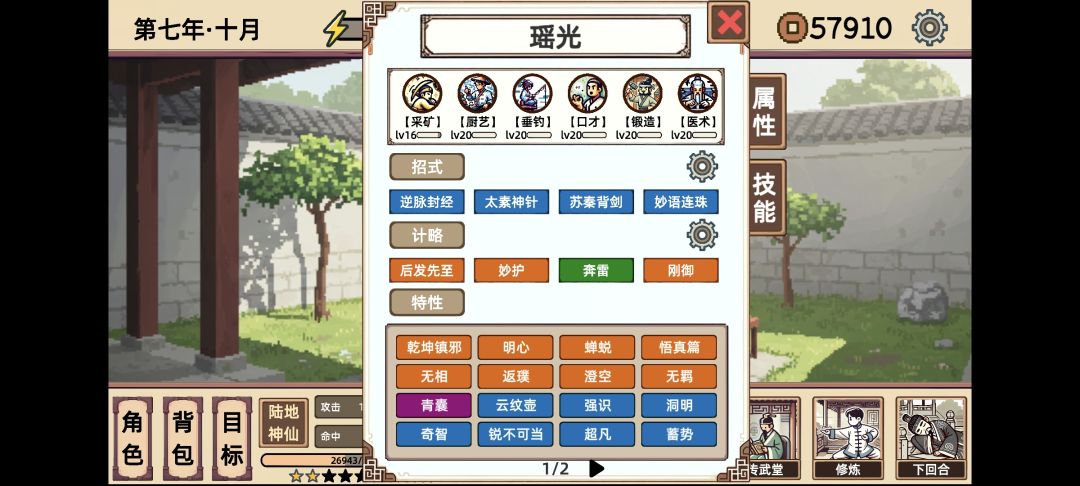 靠着大佬“又菜又爱玩”的思路,扣怪的内力,让其无法攻击。死在这里是因为两条血的怪,150回都磨不死,当然还是有几率过去,太累了。后期靠“太素”磨一次10%,其实也很快。我就两套技能切换。第一套,是为了秒杀17回必杀的,不想看广告。前期,错经改穴输出高一点。后发先制 是钓鱼出来的计略,其他计略用过来都没有这个好用,起始速度太低。中间打心魔的时候,可以先选钓鱼,接着9级的时候,行动钓鱼一次就可以出现三张计略。其实,打到这里,前面比较辛苦。刚御这张牌难出。出门带的天赋是茶壶。