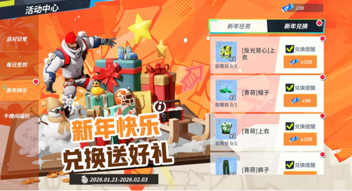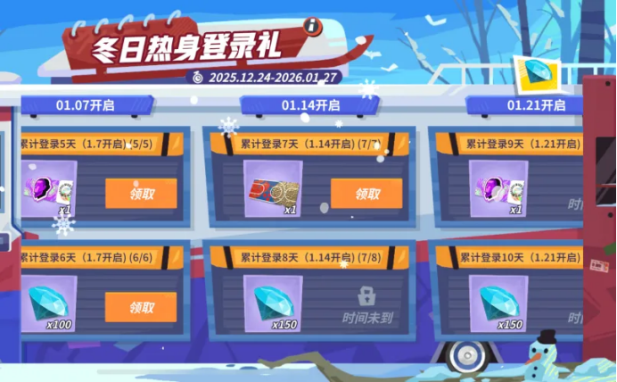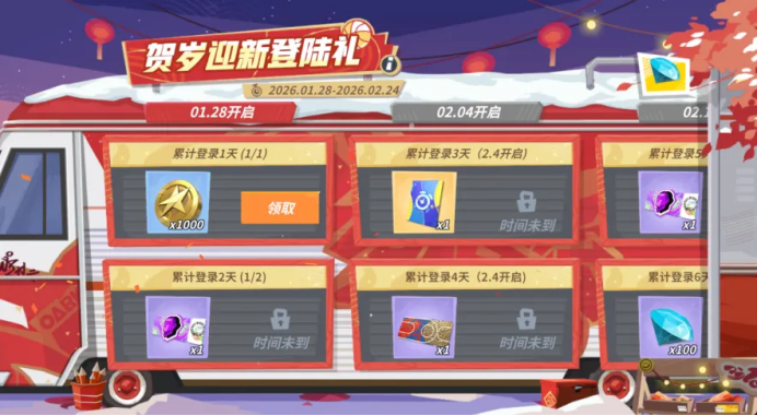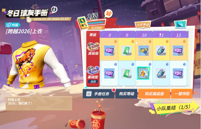 1月28日至3月3日期间,登录派对,通过对局完成个人每日任务和小队每周任务来提升[冬日球友手册]等级,逐步解锁免费时装[跨越2026]、钻石、高级特训卡、天赋中级材料等多重培养道具,为你的球星养成之路添砖加瓦。