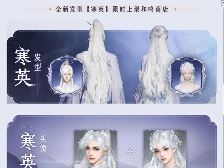 配套的新和鸣【寒英】头发只要1个八音就能换,设计很不错,男号是游戏里少见的高马尾,女号是短发刘海造型,而且头发旁边都带着雪花特效,颜值很在线。