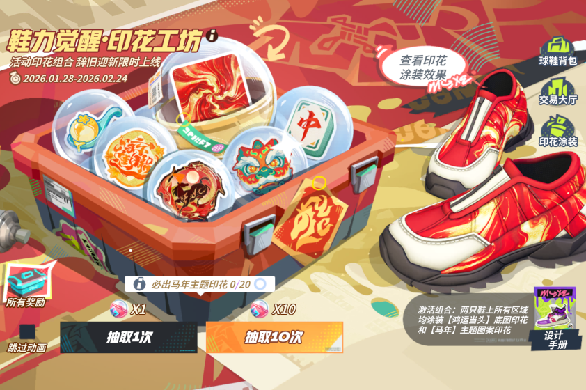 鞋力觉醒·印花工坊活动将于1月28日再次上新!截至2月24日,街球手进入活动页面使用印花解码蛋,即可参与马年主题印花抽奖!(最多20抽必得马年主题印花)