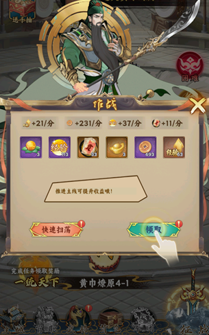 通关主线领取离线收益,粮草、铜币和经验持续累积。