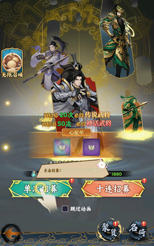 通过点将台招募武将,十连或单次累积,可轻松获得传说英雄。