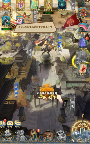 主城提供招募、神兵强化、商城、坐骑和任务等多种功能,全面提升养成与战力。